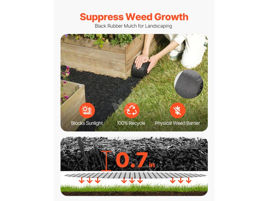Tento gumový mulčovací valec je vyrobený z vysokokvalitnej recyklovanej gumy a odoláva vplyvom počasia počas všetkých ročných období. Je trvanlivý a odolný voči poveternostným vplyvom, odoláva opotrebovaniu a je účinnou alternatívou tradičného mulčovania, čím vám ušetrí čas a peniaze na odstraňovanie buriny.