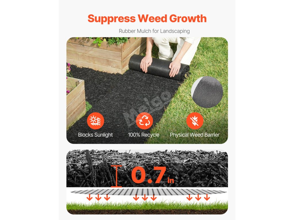 Táto gumová mulčovacia rohož vyrobená z recyklovanej gumy zabraňuje rastu buriny, umožňuje prenikanie vody a živín a udržiava pôdu kyprú. Okrem toho rozdeľuje kvetinové záhony a trávniky, zlepšuje estetiku a zabraňuje vzniku blata počas daždivých dní. Ľahko sa kladie, strihá a skladuje. Ideálne pre záhrady, sady a detské ihriská.