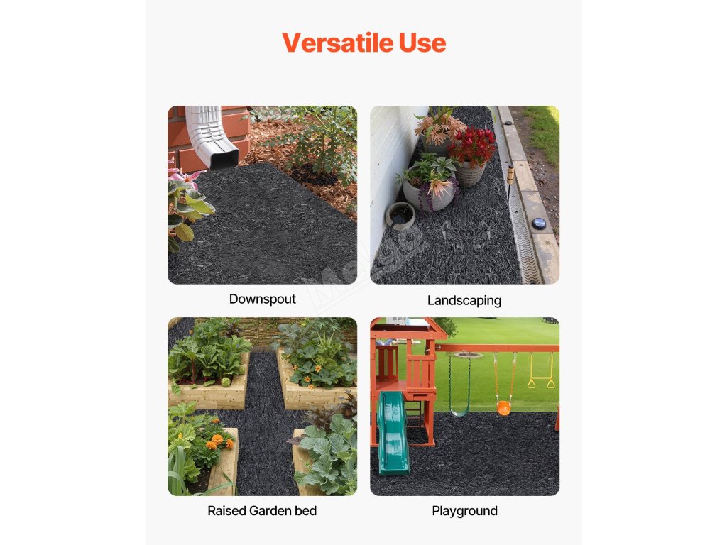 Po položení na dvore tento gumový mulčovací mtg pomáha predchádzať hromadeniu bahna a umožňuje domácim zvieratám hrať sa vonku za daždivého počasia bez špliechania. Je tiež ideálny na terasy, chodníky a vonkajšie hracie plochy, pretože poskytuje čisté prostredie aj za mokra.