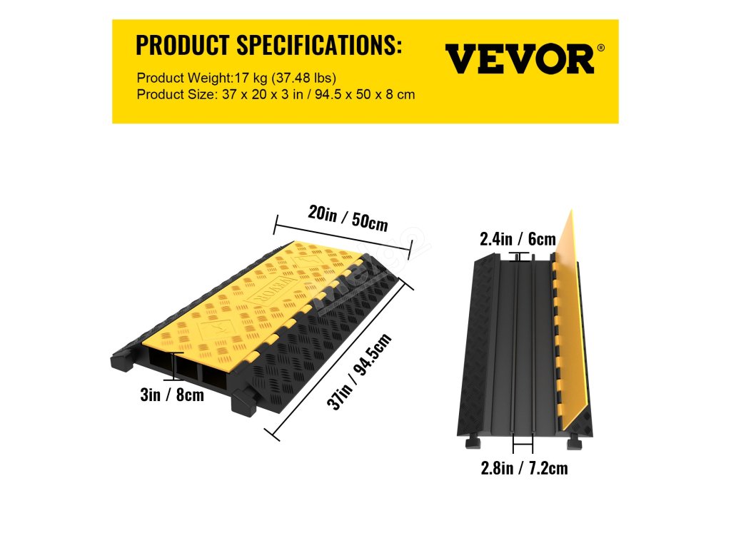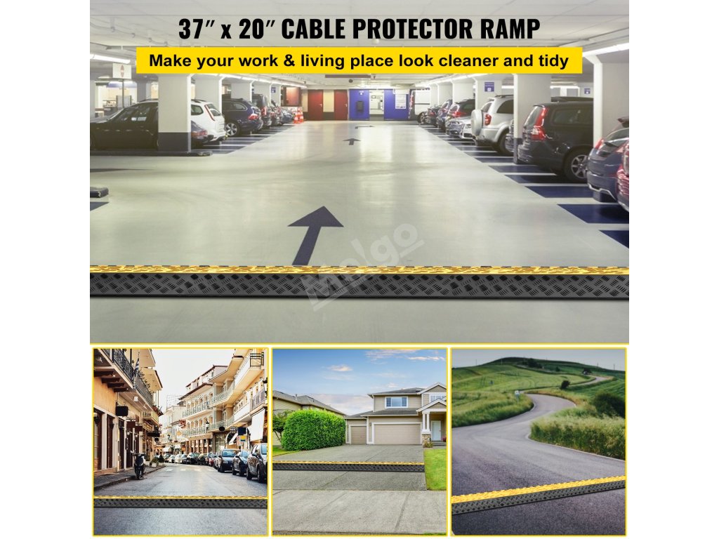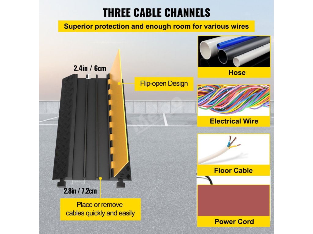 Tři kanály o rozměrech 2,8" na šířku a 2,4" na výšku (7,2 x 6 cm) z gumového příjezdového hrbolu poskytují dostatek prostoru pro elektrické kabely, napájecí vedení, hadice a prodlužovací kabely.