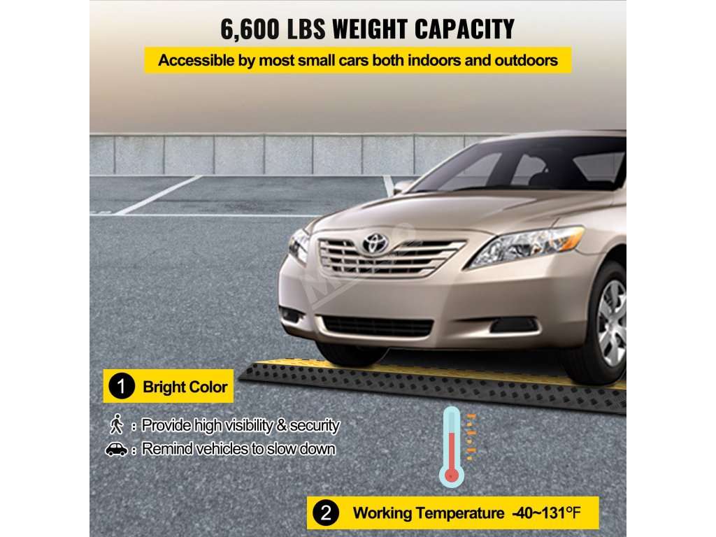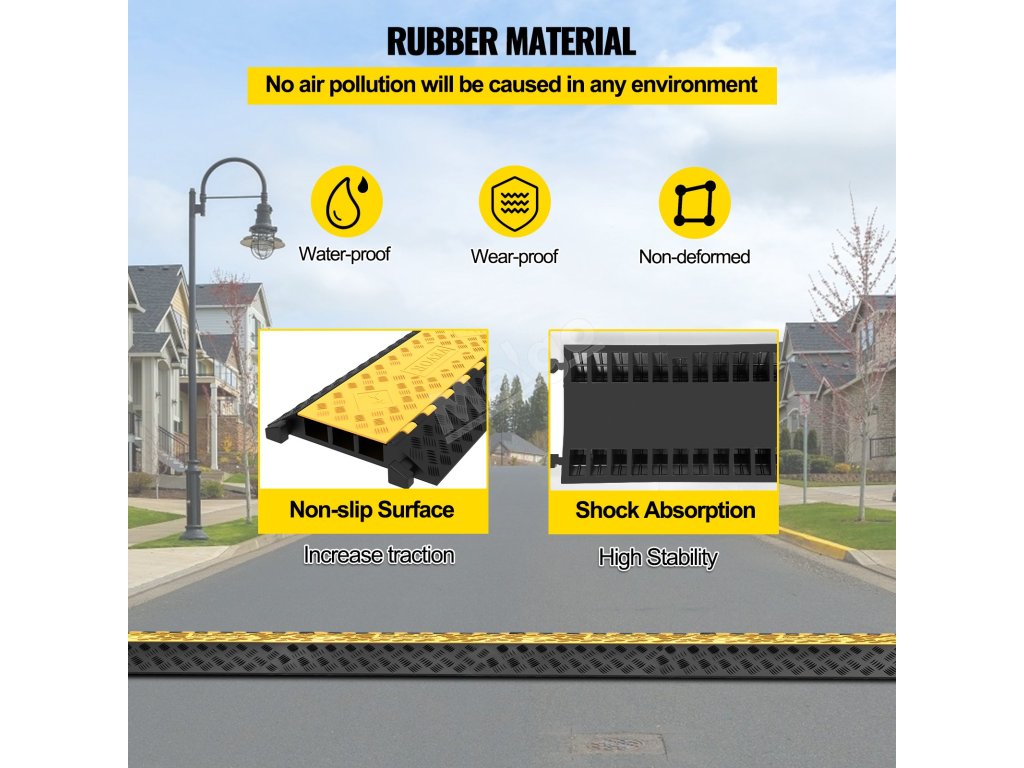 Tento gumový příjezdový hrbol je vyroben z komerční termoplastické pryže. PVC kryt je navržen s protiskluzovou strukturou na povrchu, která zajišťuje bezpečnost řidičů automobilů.