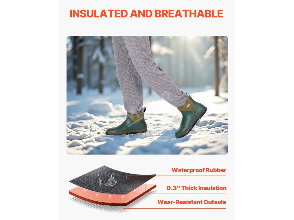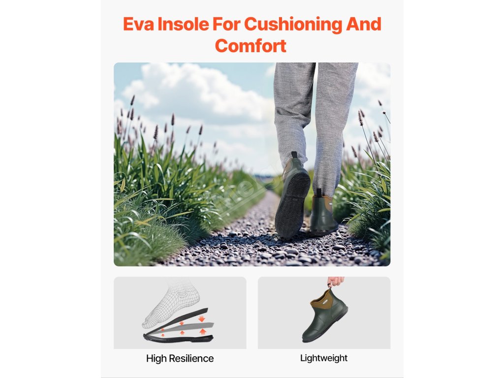 Gumené čižmy sú vyrobené z vysokokvalitnej gumy, ktorá ponúka vynikajúcu odolnosť voči mokrým podmienkam a priedušnosť, vďaka čomu vás udrží v suchu a pohodlí počas outdoorových aktivít. Stielka EVA poskytuje pohodlné nosenie, zatiaľ čo ľahká konštrukcia vám umožní ľahko riešiť rôzne situácie.