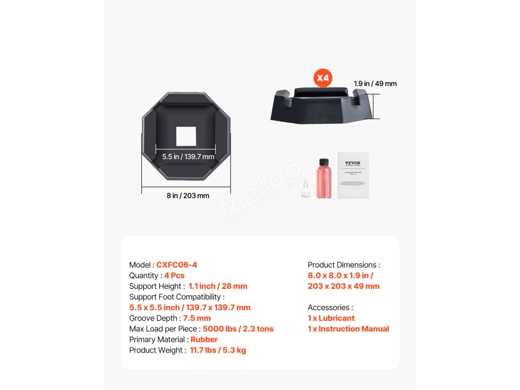 Pryžové podložky 4 ks, nosnost 5000 lbs, pro 5.5" čtvercové nohy