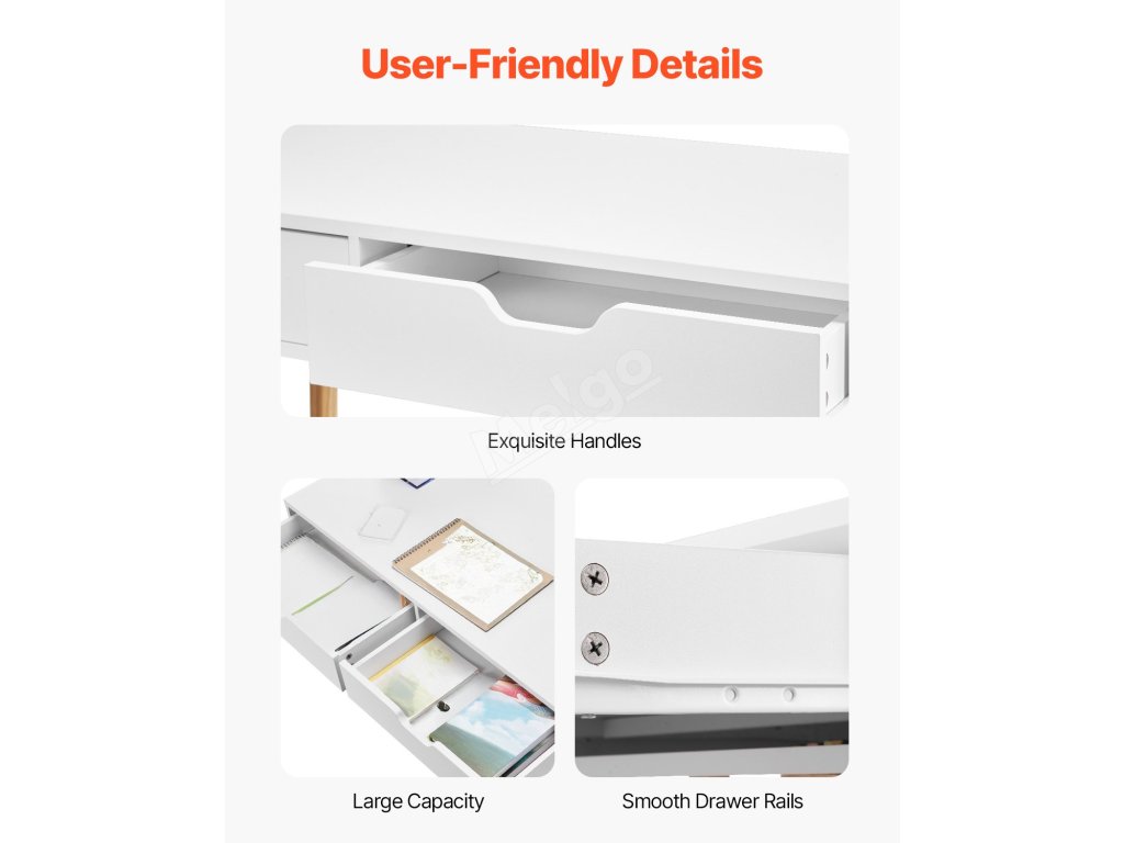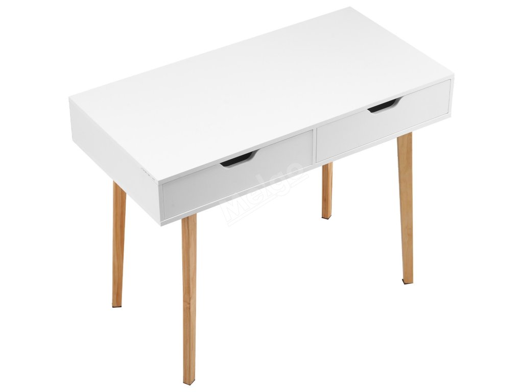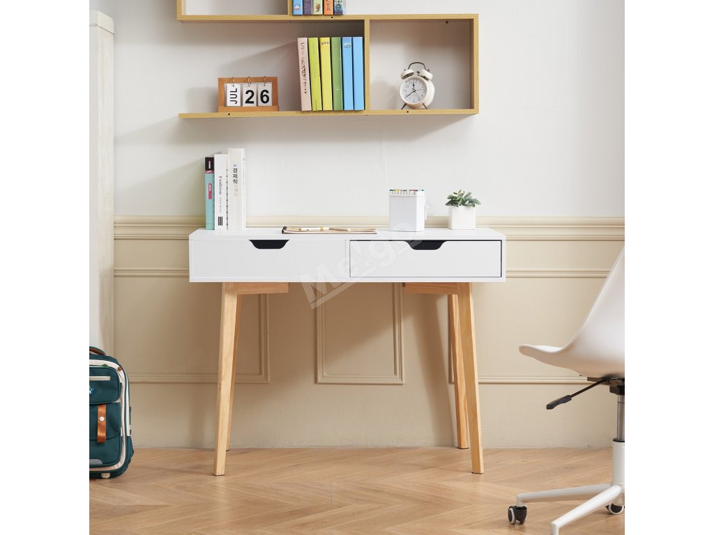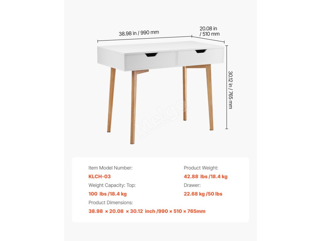 Tento psací stůl se zásuvkami má svěží bílou povrchovou úpravu doplněnou přírodním hnědým umělým dřevem a elegantními černými kovovými nohami a nabízí elegantní a moderní vzhled, který se hodí k jakémukoli stylu vybavení domácnosti.
