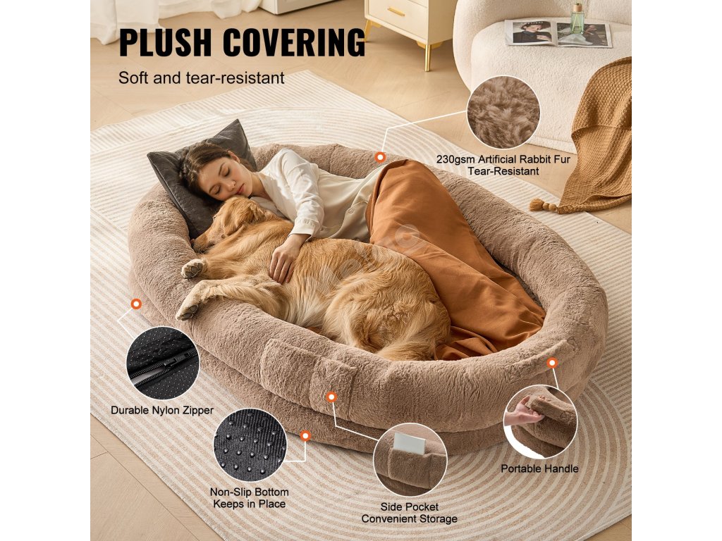 Tento lidský pelíšek pro dospělé psy, potažený měkkou umělou králičí kožešinou a podepřený pěnovou matrací, je robustní a odolný se stabilní oporou.