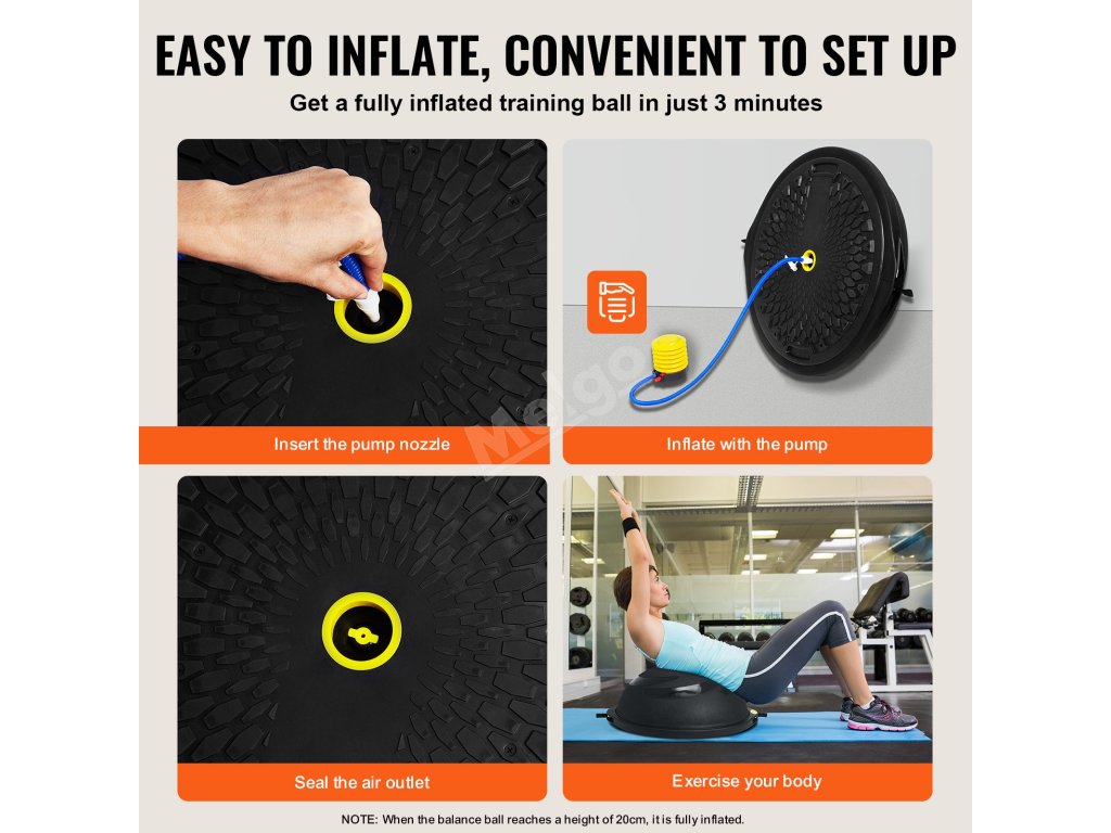 Instalace polovičního míče na jógu je rychlá a snadná. Stačí míč připevnit a sešlápnout přiloženou nožní pumpičku pro naplnění. Míč se nafoukne během minuty a vyprázdní během několika sekund. Dodává se s bezplatnou nožní pumpičkou pro rychlé nafouknutí, vysoce kvalitní vzduchový ventil zabraňuje úniku a zajišťuje dlouhou životnost.