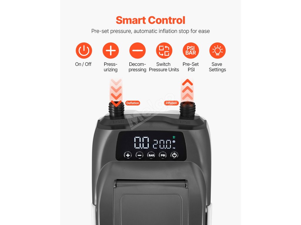 Po dosažení cílového tlaku se čerpadlo paddleboardu automaticky vypne. Displej LED zobrazuje tlak v reálném čase, tlačítka a přepínání jednotek jsou snadno ovladatelná. Poslední nastavení se ukládá, což snižuje potřebu častého nastavování.