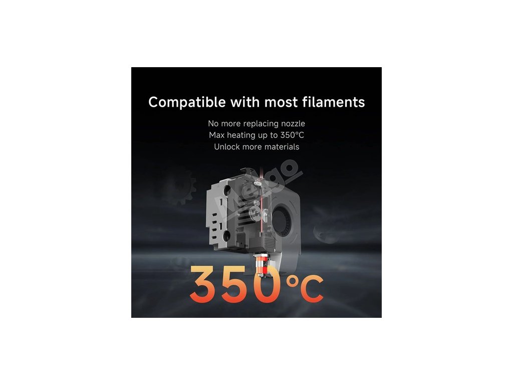 PLA, PETG, TPU, PVA, PET, ABS, ASA, PA, PC, uhlíková vlákna, vlákna ze skleněných vláken, vlákna pro 3D tiskárny FDM atd. 350 °C bimetalová tryska splňuje požadavky většiny materiálů. Dutá konstrukce nové generace s vícemetalovým horkým koncem, přímý extrudér bez ucpávání.