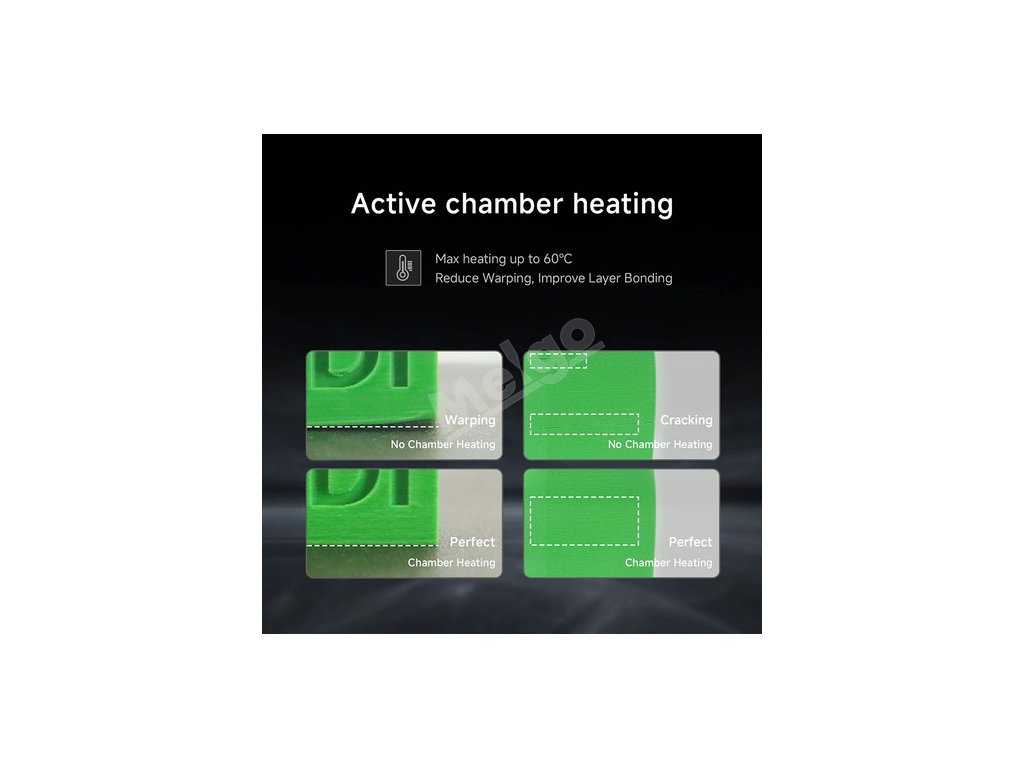 3D tiskárna QIDI Q1 Pro dokáže aktivně ohřívat a regulovat teplotu v komoře. Plně uzavřená, přesně řízená teplota v komoře (až 60 °C nebo 140 °F) zlepšuje kvalitu tisku a přilnavost vrstev, zejména u filamentů náchylných k deformaci, jako jsou ABS, PA a PC.