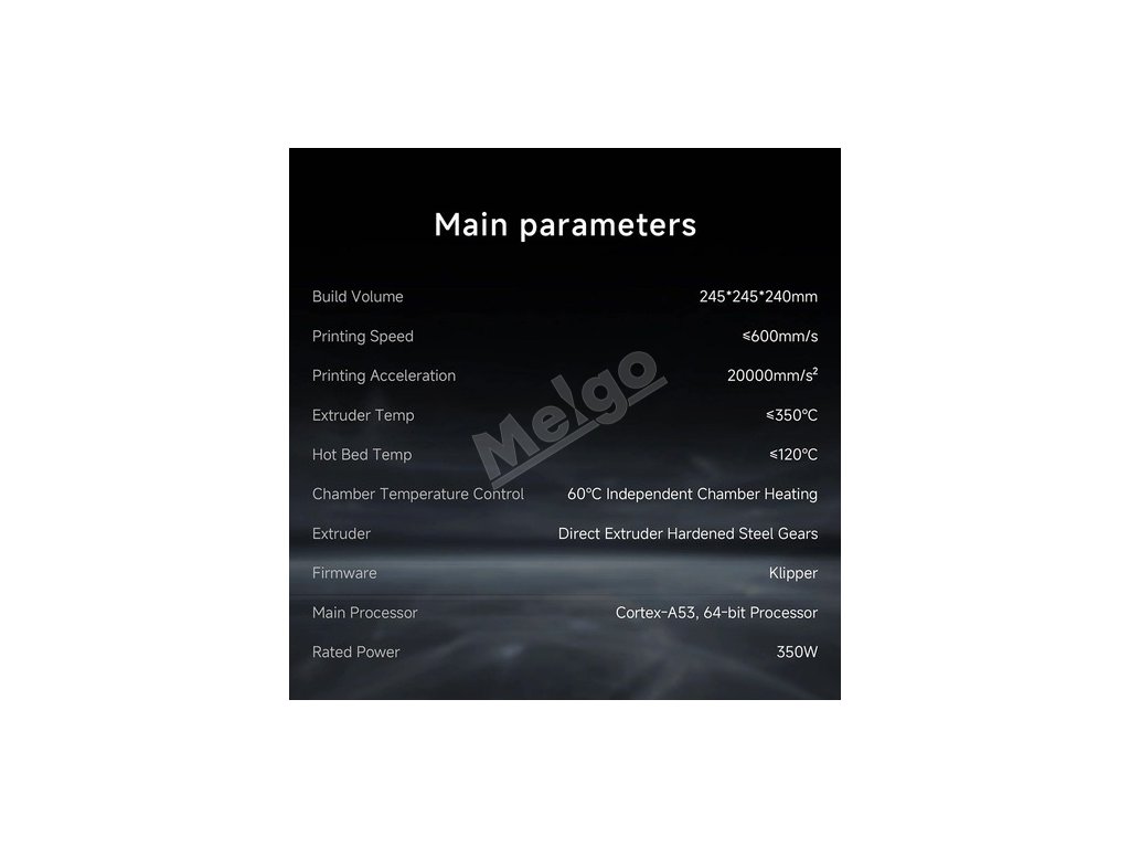 | Specifikace | Stavební objem: 245x245x240mm Rychlost tisku: ≤600 mm/s Rychlost tisku: 20000 mm/s2 Teplota extrudéru: ≤350 °C Teplota horkého lože: ≤120 °C Regulace teploty v komoře: 60 °C Nezávislý ohřev komory Extruder: Hlavní procesor: Klipper Hlavní procesor: Cortex-A53, 64bitový procesor Jmenovitý výkon: 350 W |