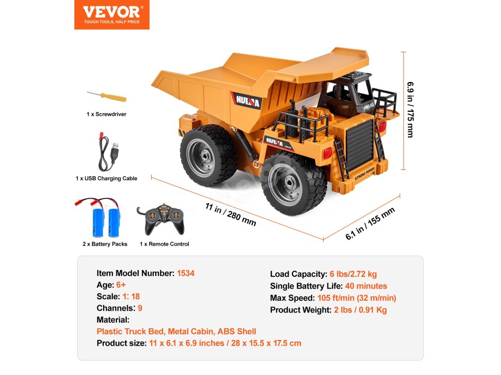 Zažijte vzrušení z reálného provozu s tímto RC sklápěčem! Díky funkcím, které se ovládají jedním dotykem, jako je lože nákladního vozu, prostor pro baterii a simulovaná hydraulická tyč, působí jako skutečný. Zvukové efekty a protiskluzová gumová kola ještě umocňují zábavu!