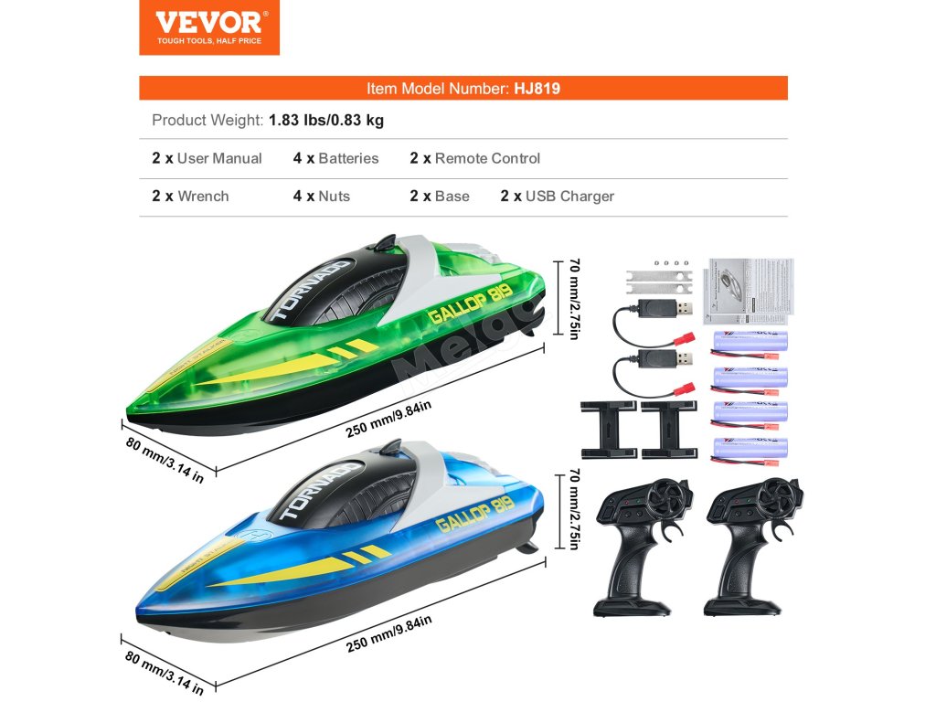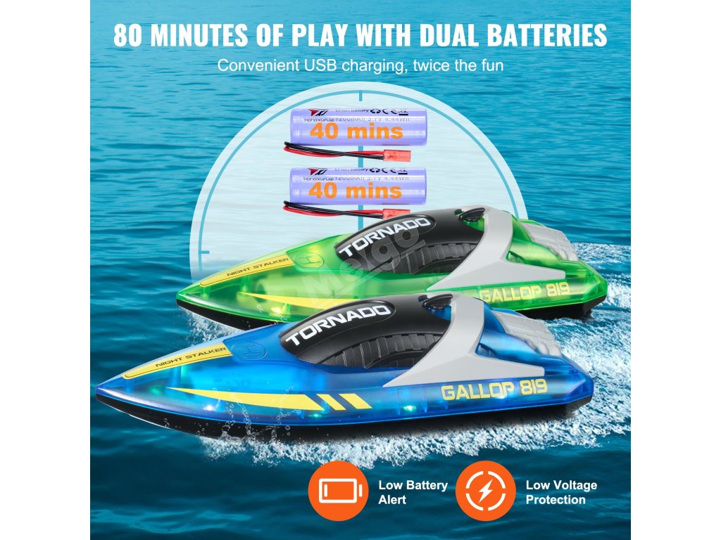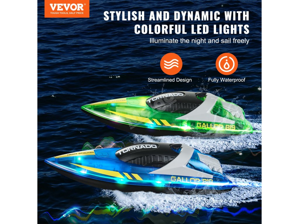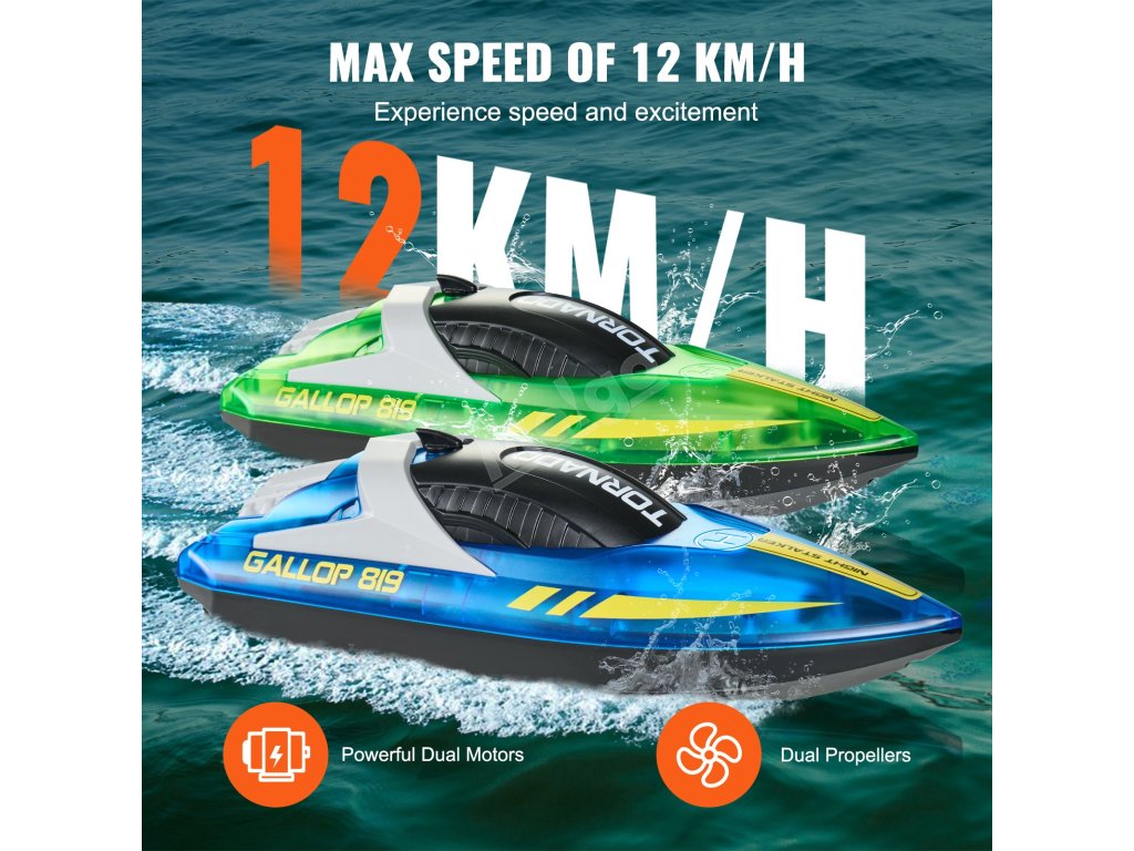 Díky dvěma motorům a lodním šroubům má tento dálkově ovládaný člun silný a stabilní výkon a dosahuje rychlosti až 12 km/h. Je ideální pro zvýšení vzrušení a zábavy při jakékoli vodní aktivitě.