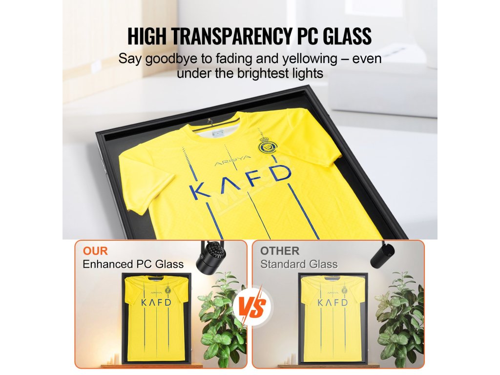 Naše vitrína na dresy, vyrobená z dřevěného rámu a vysoce průhledného PC panelu odolného proti UV záření, zajistí, že váš dres zůstane chráněný a zároveň si zachová své živé barvy a textury. Díky pantům a kolíčkům můžete své cenné dresy a památeční předměty vystavovat stylově a chráněně!