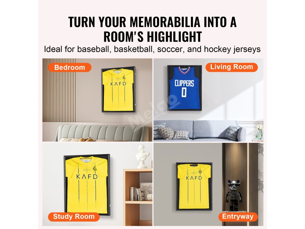 Tato vitrína na dresy je ideální pro vystavení různých sportovních dresů včetně fotbalových, basketbalových, fotbalových, baseballových atd. Je také ideální pro vystavení dalších typů memorabilií a sběratelských předmětů, jako jsou podepsané fotografie, středoškolské diplomy, pamětní medaile a další.