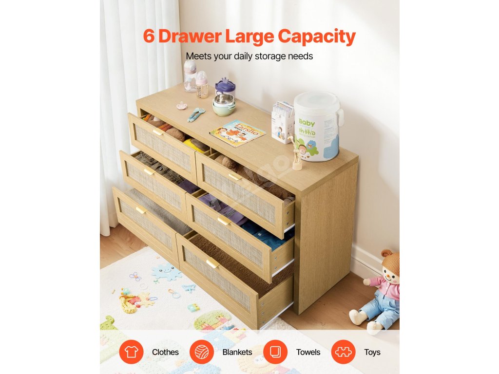 Naše prostorná ratanová komoda nabízí několik vrstev úložného prostoru. Díky hlubším a širším zásuvkám do ní lze přehledně uložit velké množství oblečení a věcí denní potřeby. Na horní plochu lze uložit dekorace nebo často používané předměty, čímž se splní různé potřeby organizace domácnosti.