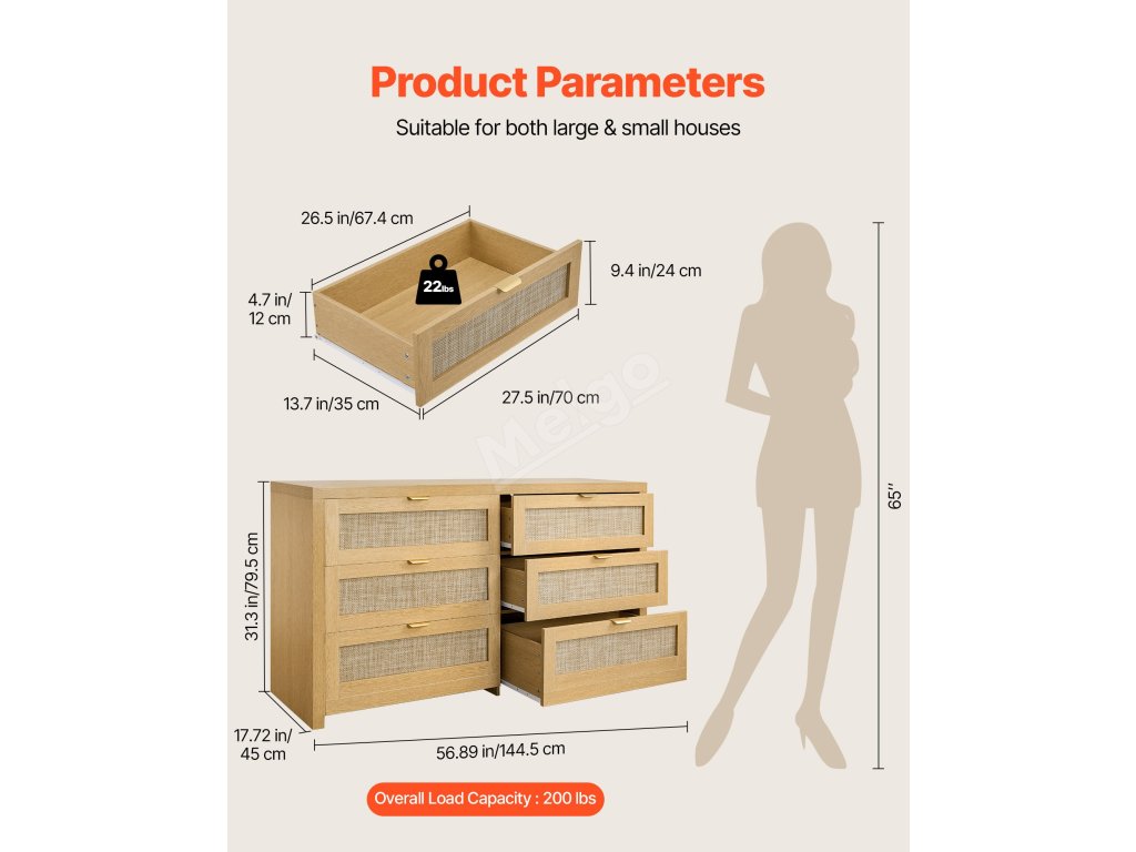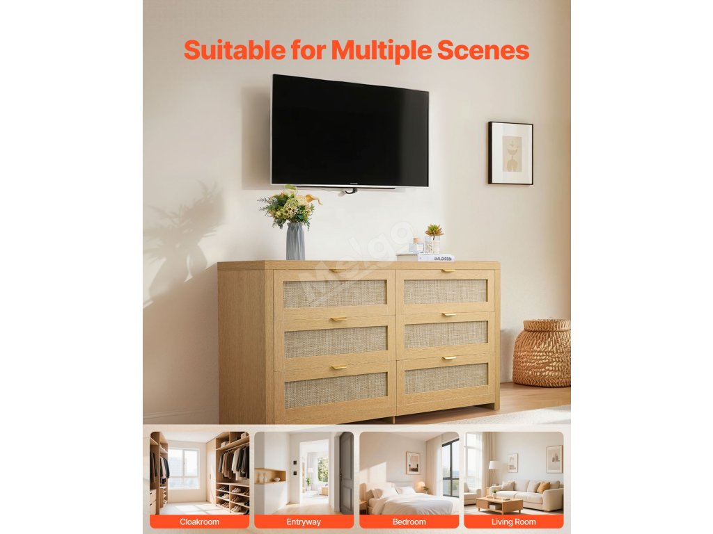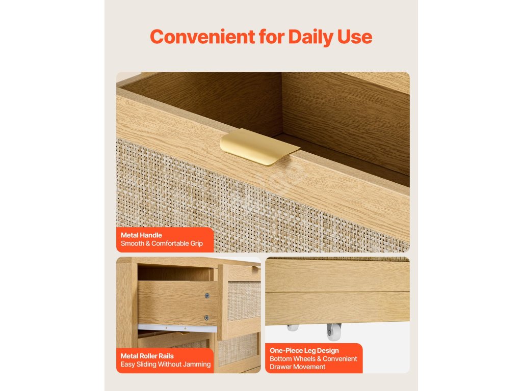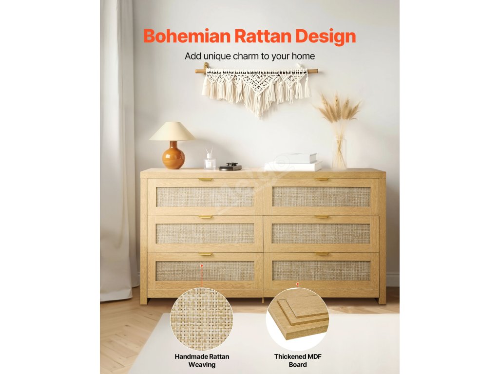 Naše boho komoda je vybavena kovovými úchytkami, které zajišťují pohodlné uchopení, a posuvnými kolejnicemi, které zůstávají hladké při tlačení a tahání. Její vysoce podpěrné nohy a zařízení proti překlopení zajišťují spolehlivé používání, odolávají opotřebení při každodenním používání, takže bude dlouho vypadat jako nová.