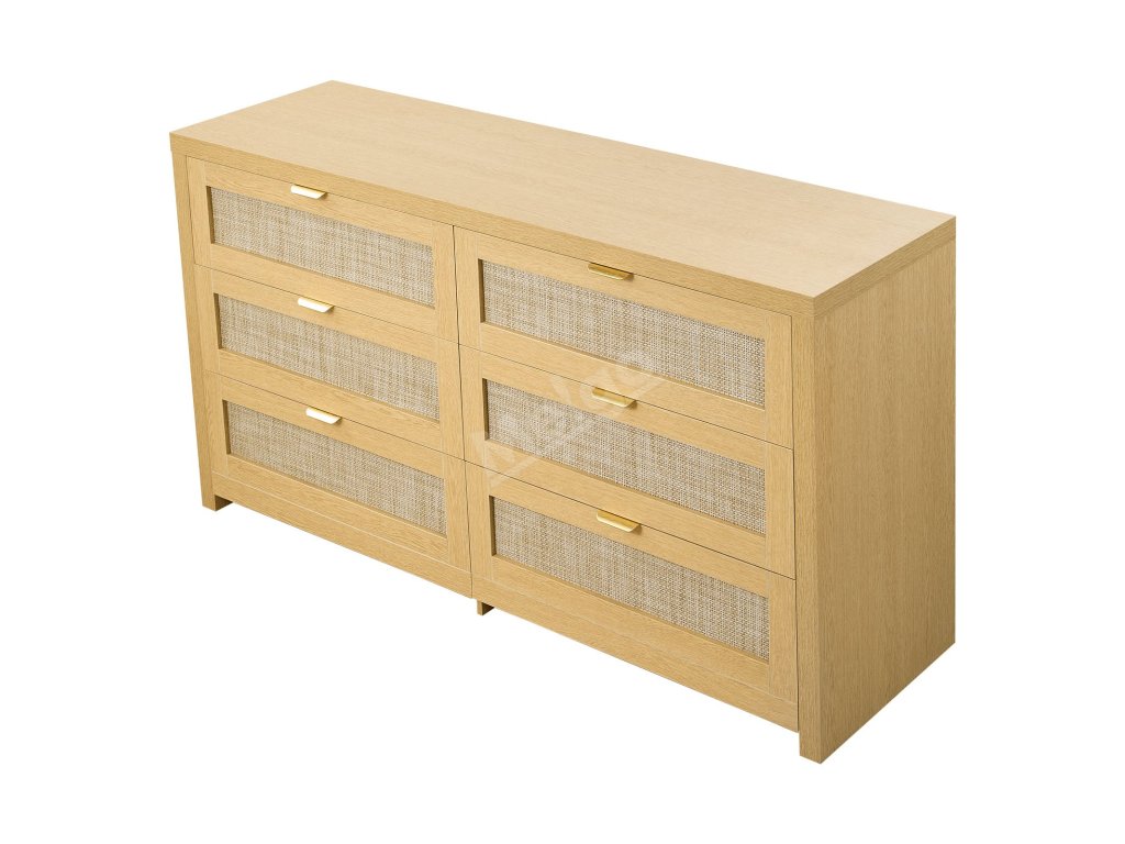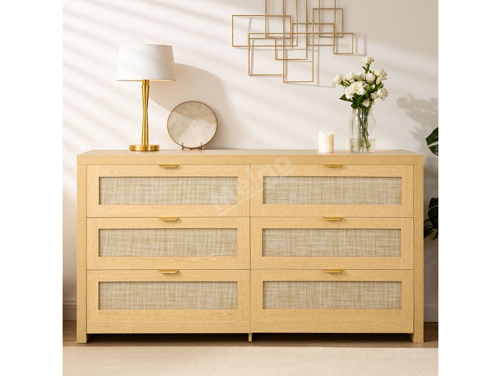 Ratanová komoda s 6 zásuvkami, kovové úchyty, do ložnice, burlywood