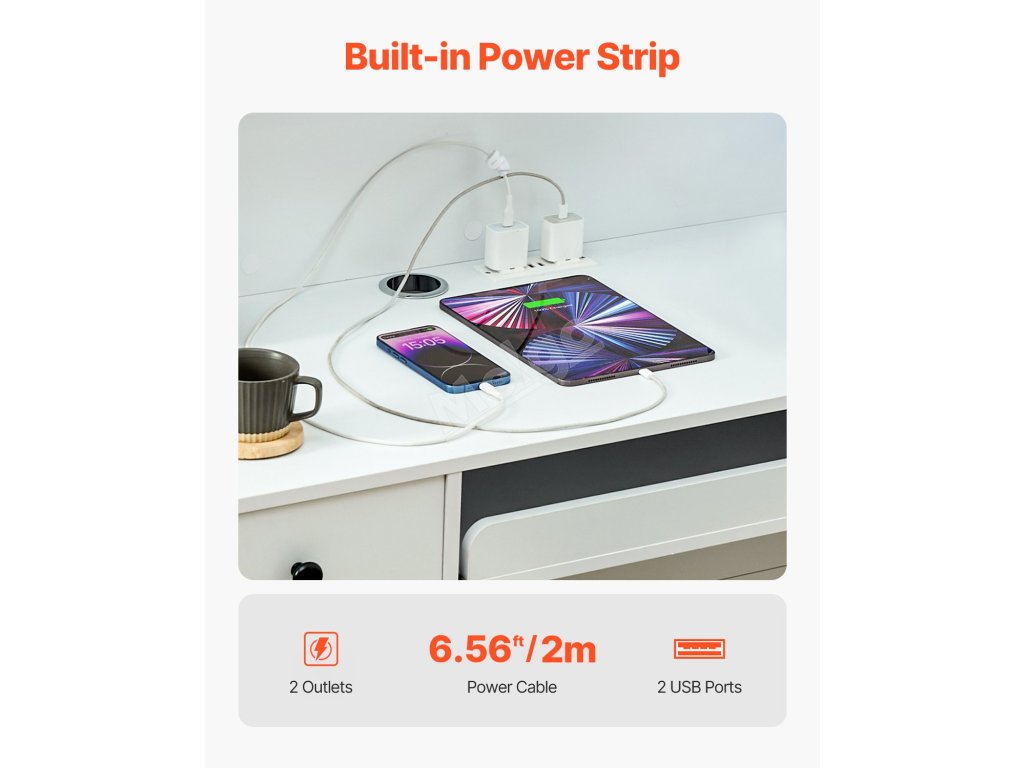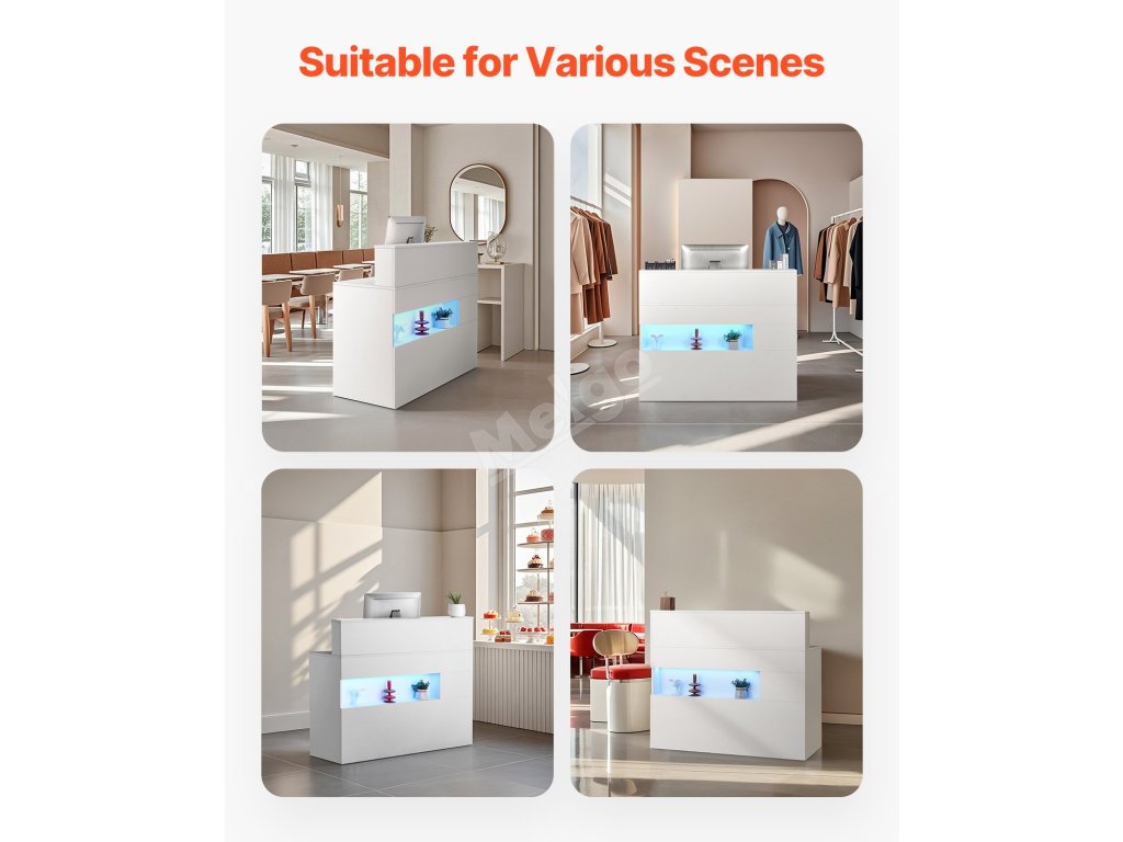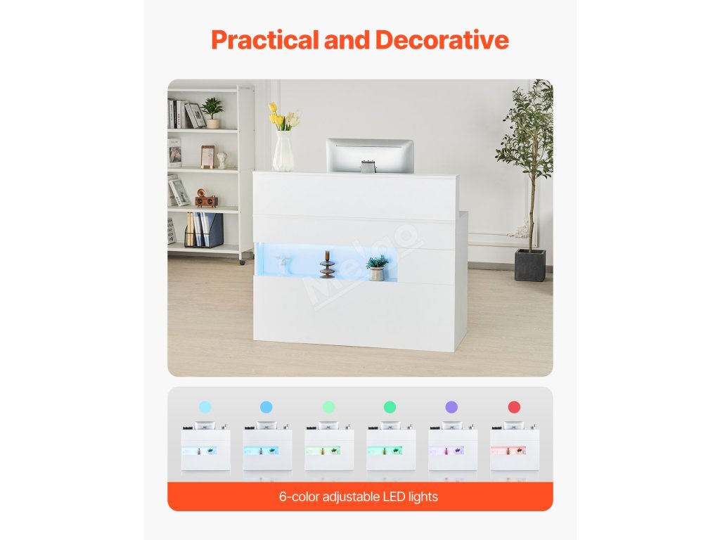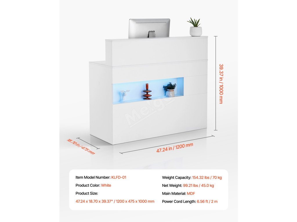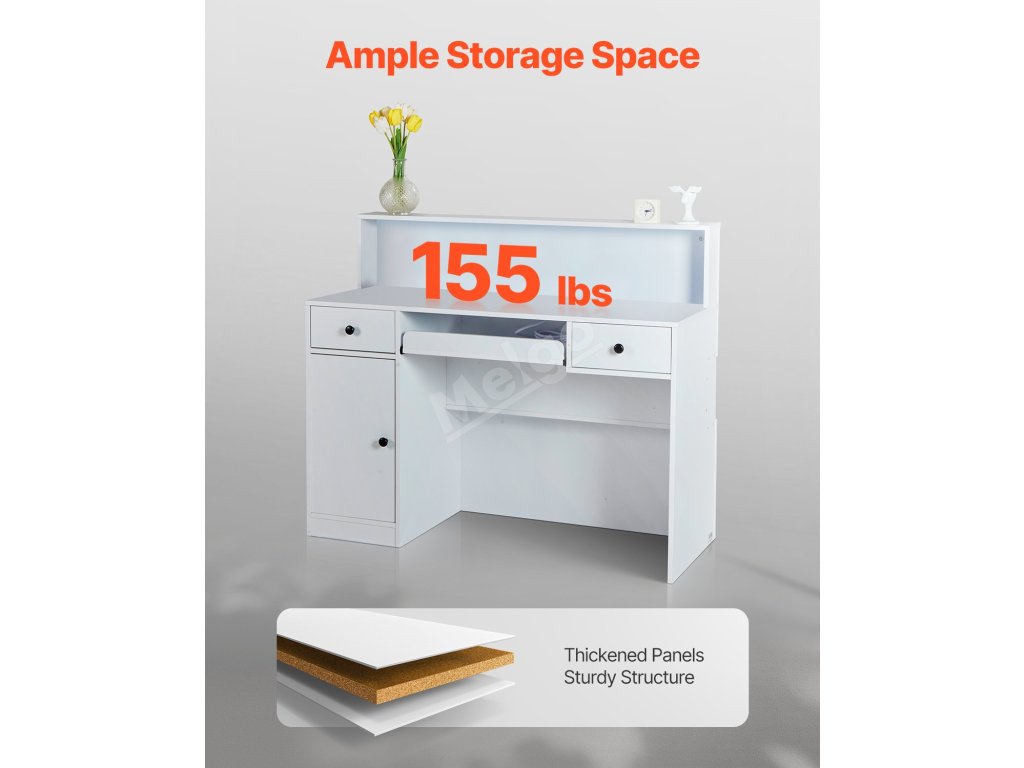 Tento recepční stůl je vyroben z odolné MDF desky s hladkým, voděodolným povrchem. Je vybaven výsuvem pro klávesnici, 2 zásuvkami a úložnou skříňkou, které poskytují dostatek prostoru. Je ideální pro komerční prostory a má elektrické zásuvky, porty USB a světelný LED pásek. Snadno se sestavuje pomocí návodu.