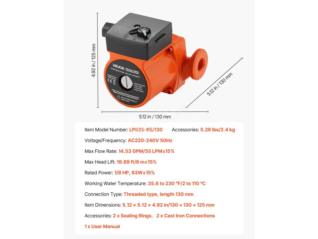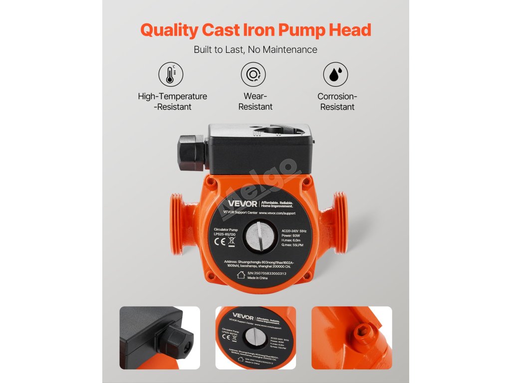 Toto litinové oběhové čerpadlo je vyrobeno z vysoce kvalitní litiny, která zajišťuje odolnost a stabilitu pro dlouhodobé používání s minimální údržbou. Jeho silný výkon zvyšuje účinnost cirkulace teplé vody, rychle ohřívá vnitřní prostory a splňuje každodenní potřeby cirkulace teplé vody.