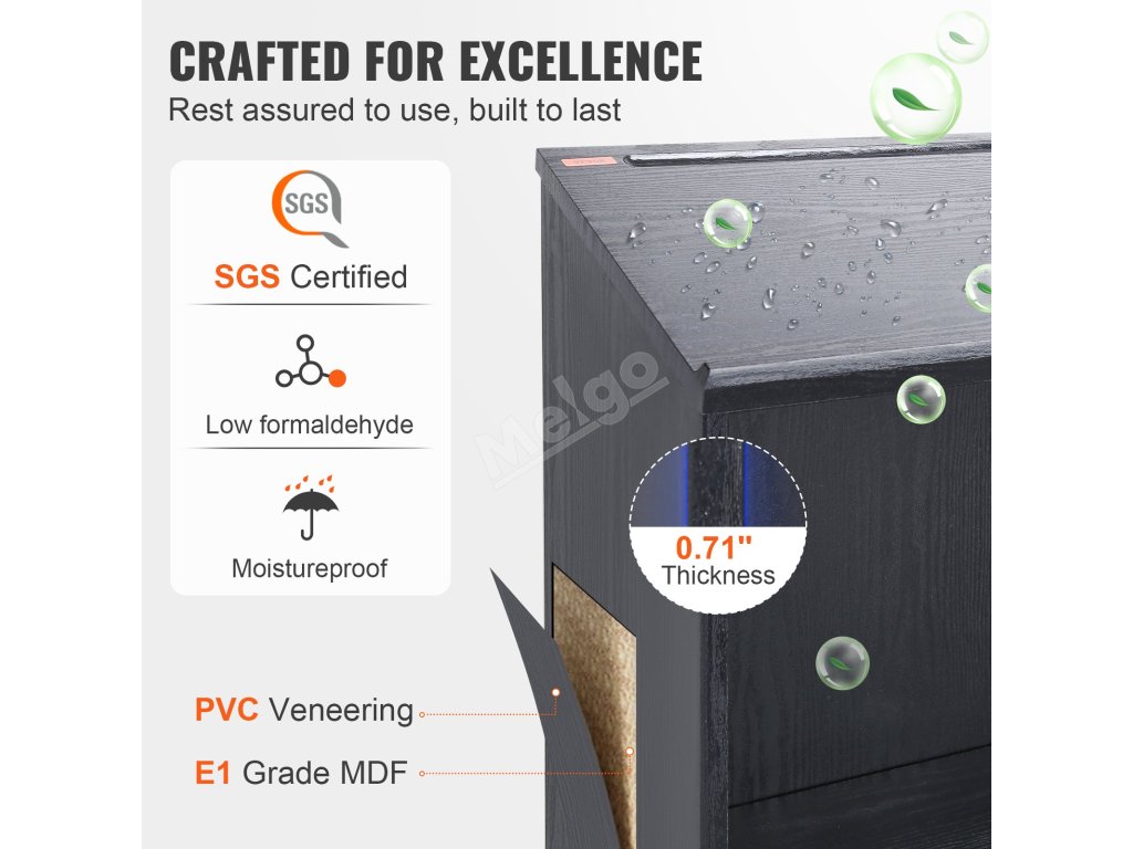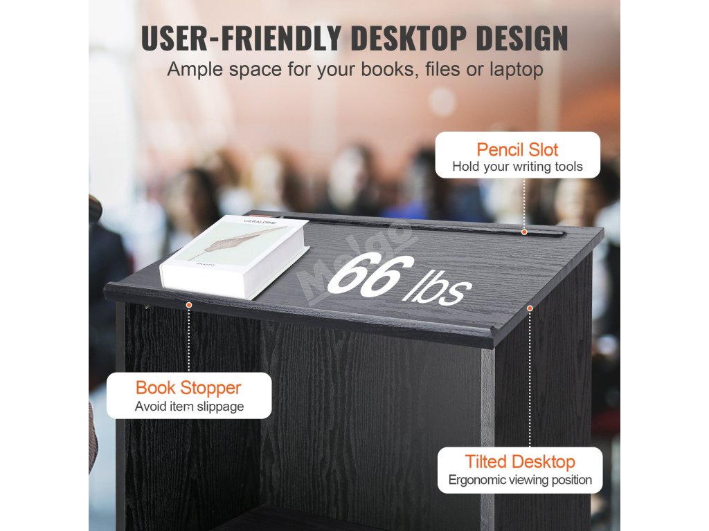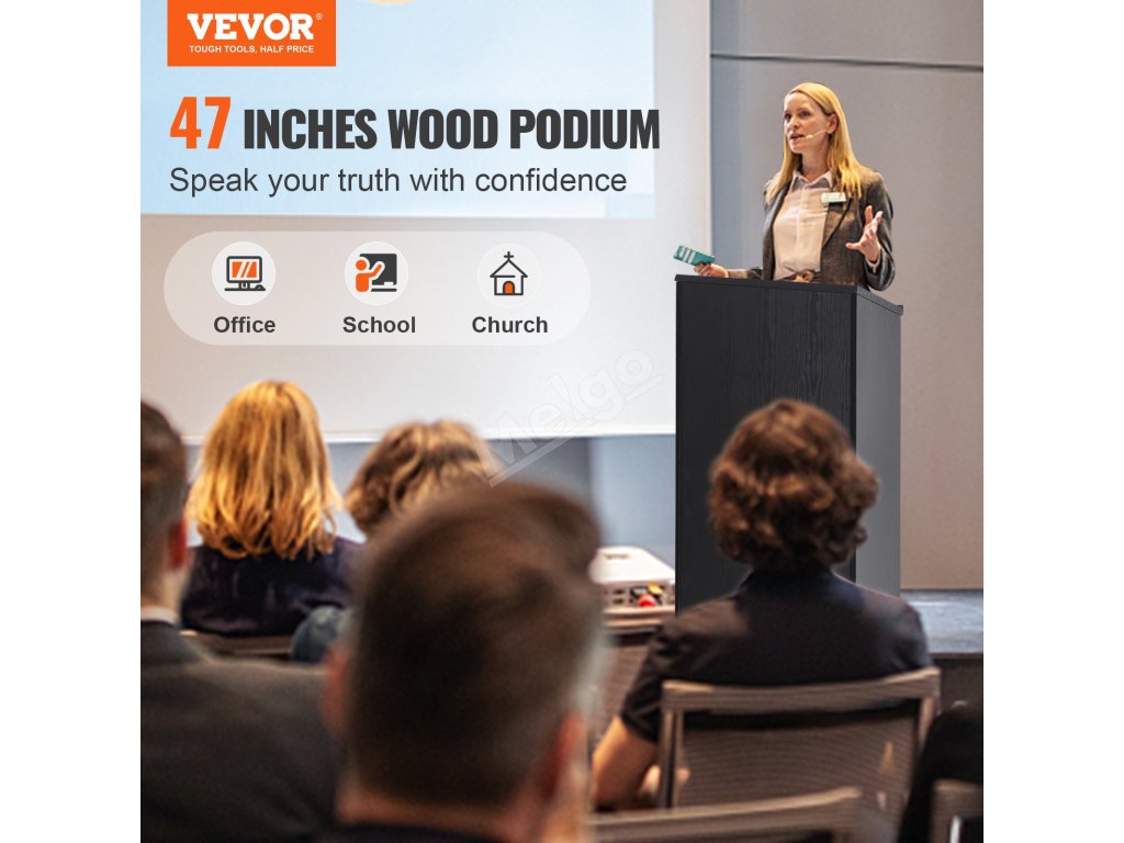 Pódium VEVOR je vyrobeno z MDF desek s certifikací CARB a dýhy z PVC, je robustní, odolné proti opotřebení a snadno se čistí.