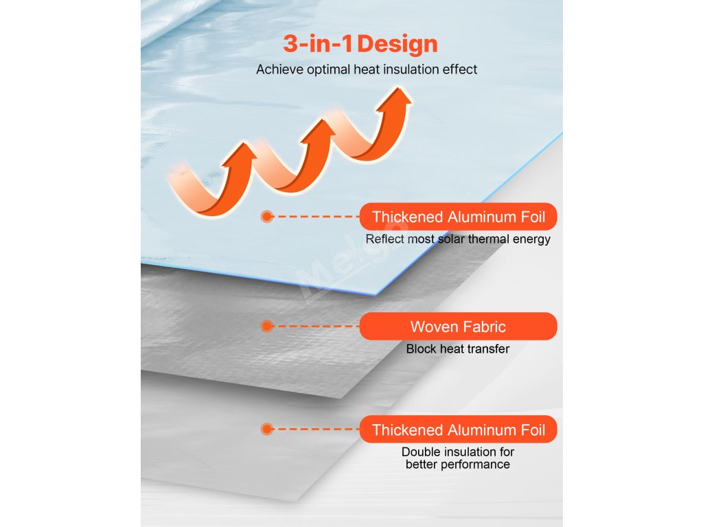 Náš tepelný štít je vyroben z vysoce kvalitní oboustranné reflexní hliníkové fólie a je navržen tak, aby byl odolný proti roztržení a propíchnutí, poškrábání a opotřebení, což zajišťuje výjimečnou trvanlivost a stabilitu při dlouhodobém používání.