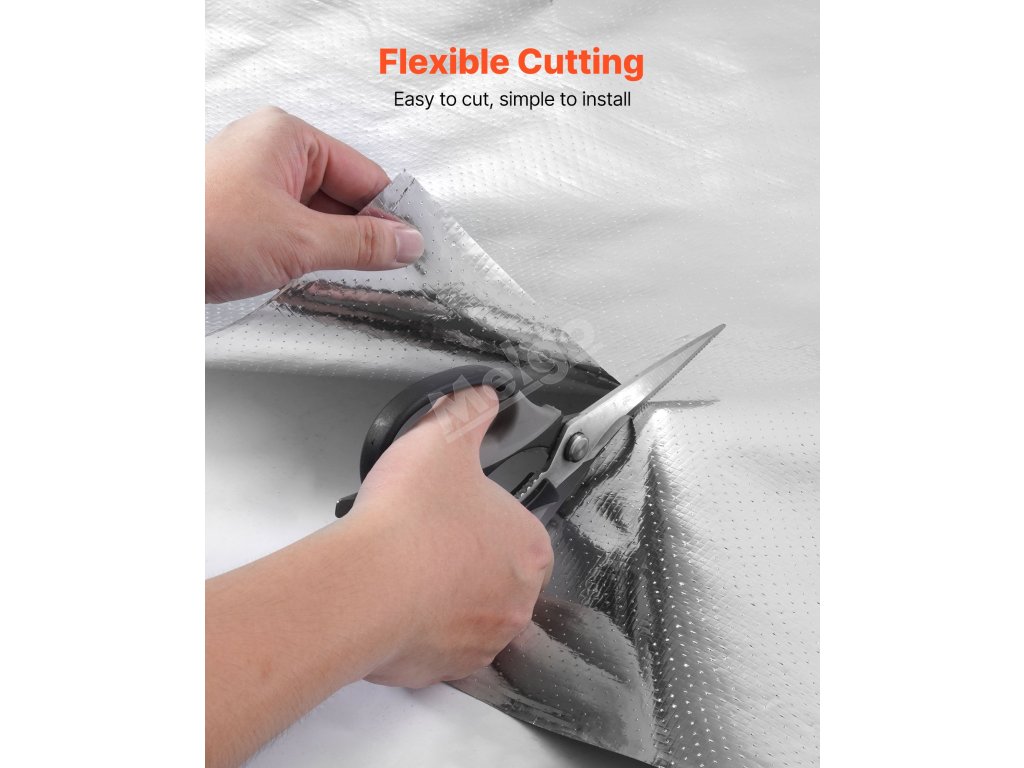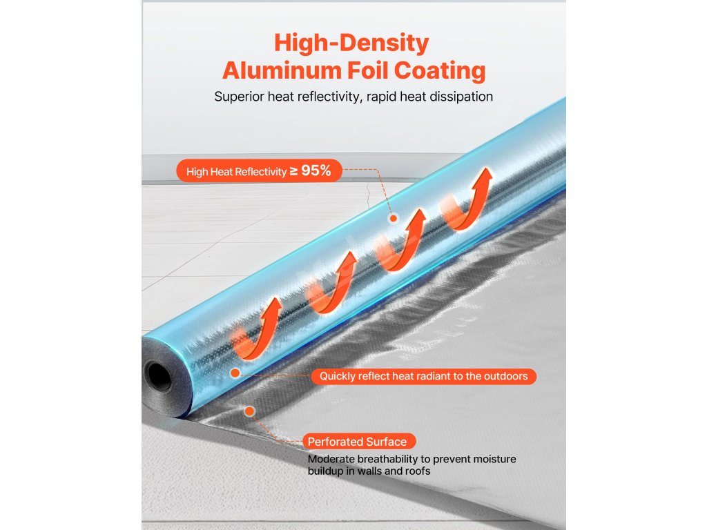 Dvojitá reflexní izolační role VEVOR má ≥ 95 % vysokou odrazivost, používá dvojitou reflexní hliníkovou fólii a perforovanou tkaninu. V létě blokuje sluneční záření a v zimě zabraňuje tepelným ztrátám, čímž udržuje příjemnou teplotu v interiéru.