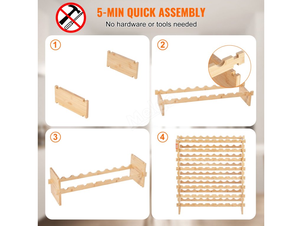 Instalace našeho bambusového stojanu na víno je rychlá a snadná, zabere jen 5 minut a nevyžaduje žádné nářadí ani hardware. Pokud potřebujete stojan přemístit, nezapomeňte nejprve vyjmout lahve.