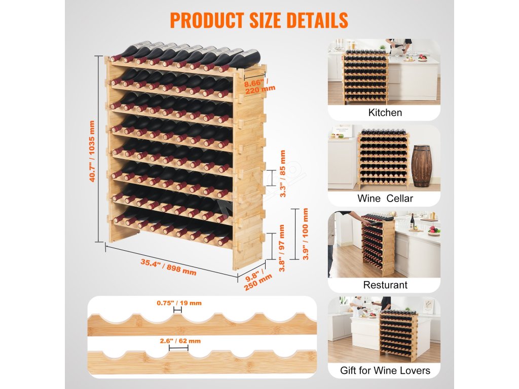 Tento stojan na víno má rozměry přibližně 898x250x1035 mm (35,4x9,8x40,7 palců) a pojme až 72 lahví (8 vrstev, 9 lahví na vrstvu).