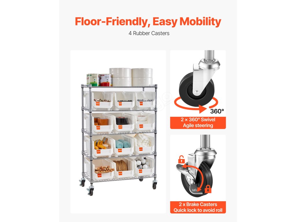 Tento regál na součástky se pohybuje na dvou otočných kolečkách a dvou otočných kolečkách s aretací pro rychlé otáčení ve stísněných prostorech. Brzdy se zacvaknou a sestava zůstane na místě, zatímco vy nakládáte, třídíte a chytáte.