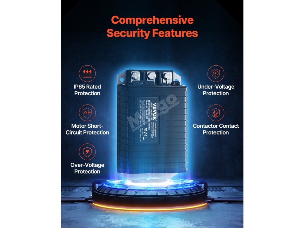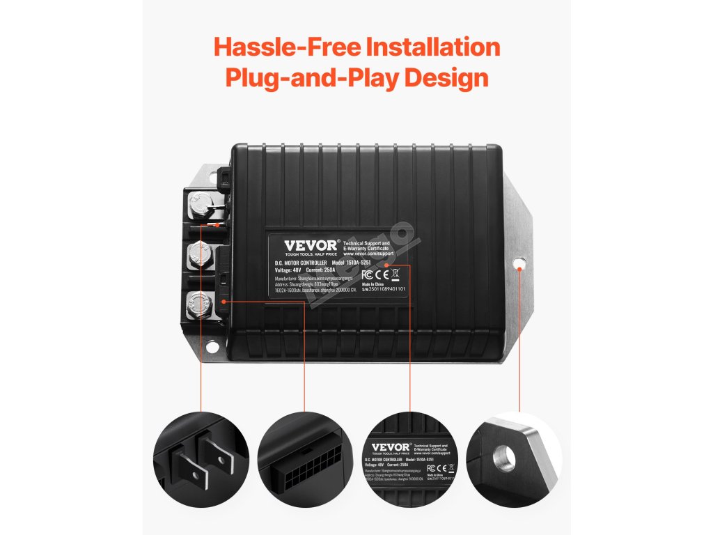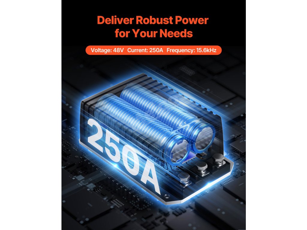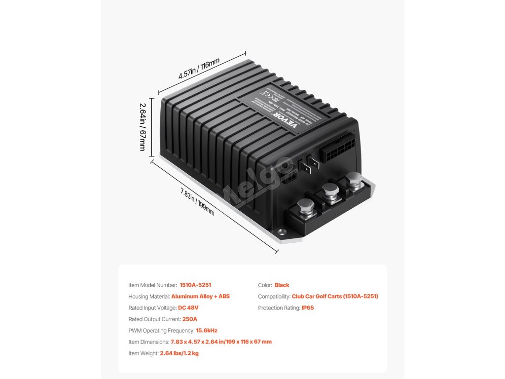 Tento regulátor motoru golfového vozíku je vybaven rychlým startem pro okamžitou reakci na plyn a plynulou akceleraci. Se vstupem 48 V a výstupem 250 A zajišťuje plynulou, efektivní jízdu a přesnou regulaci otáček.