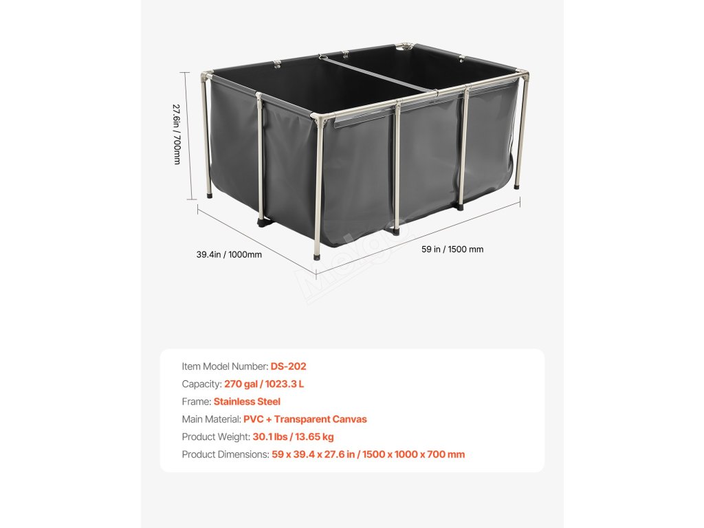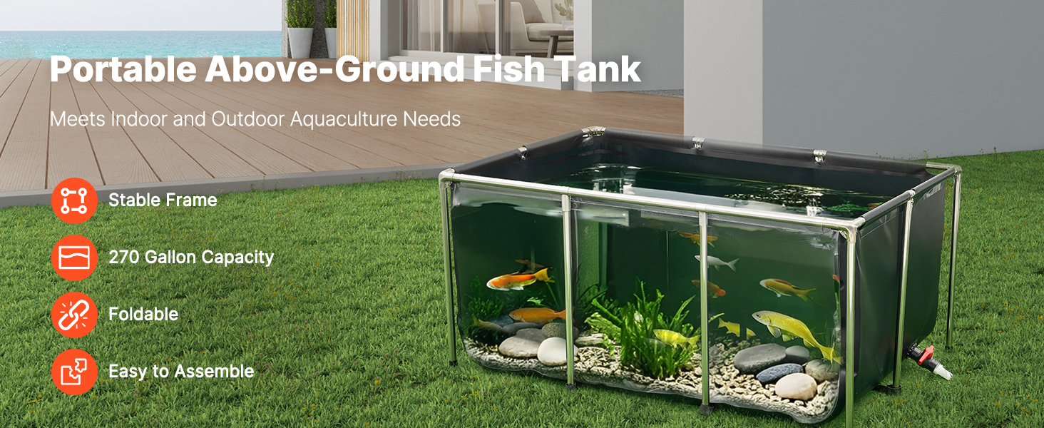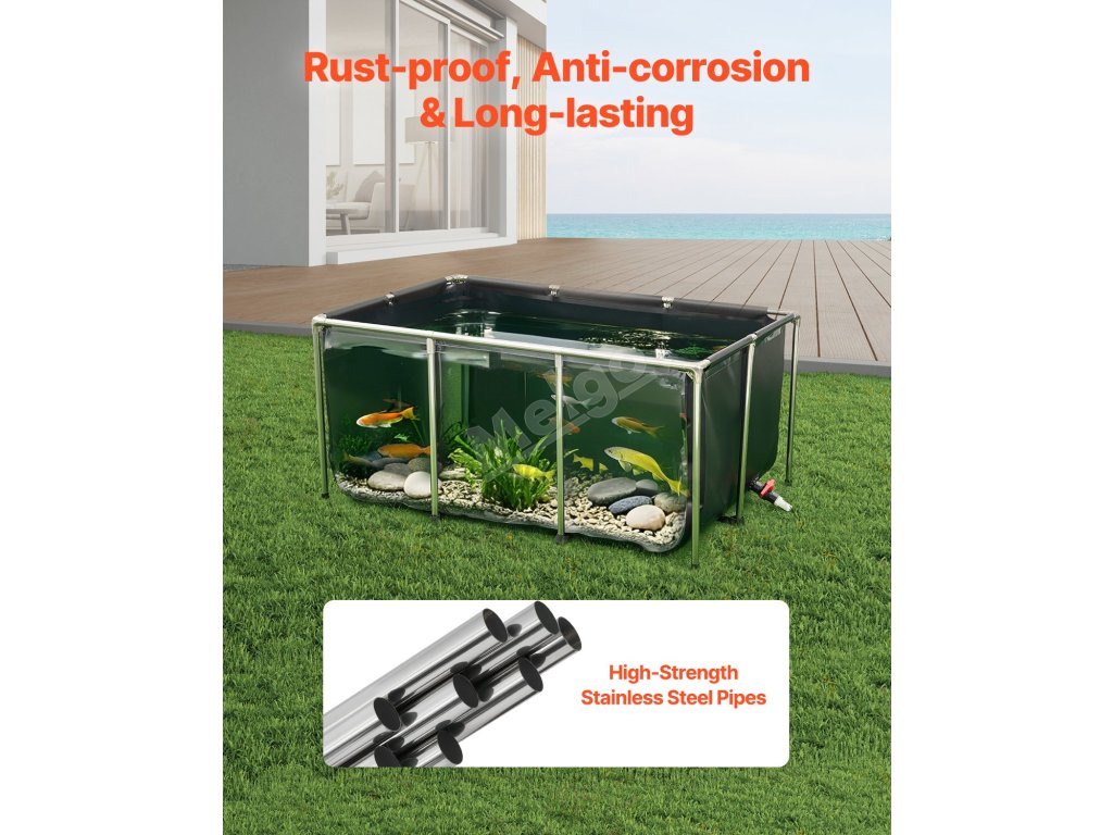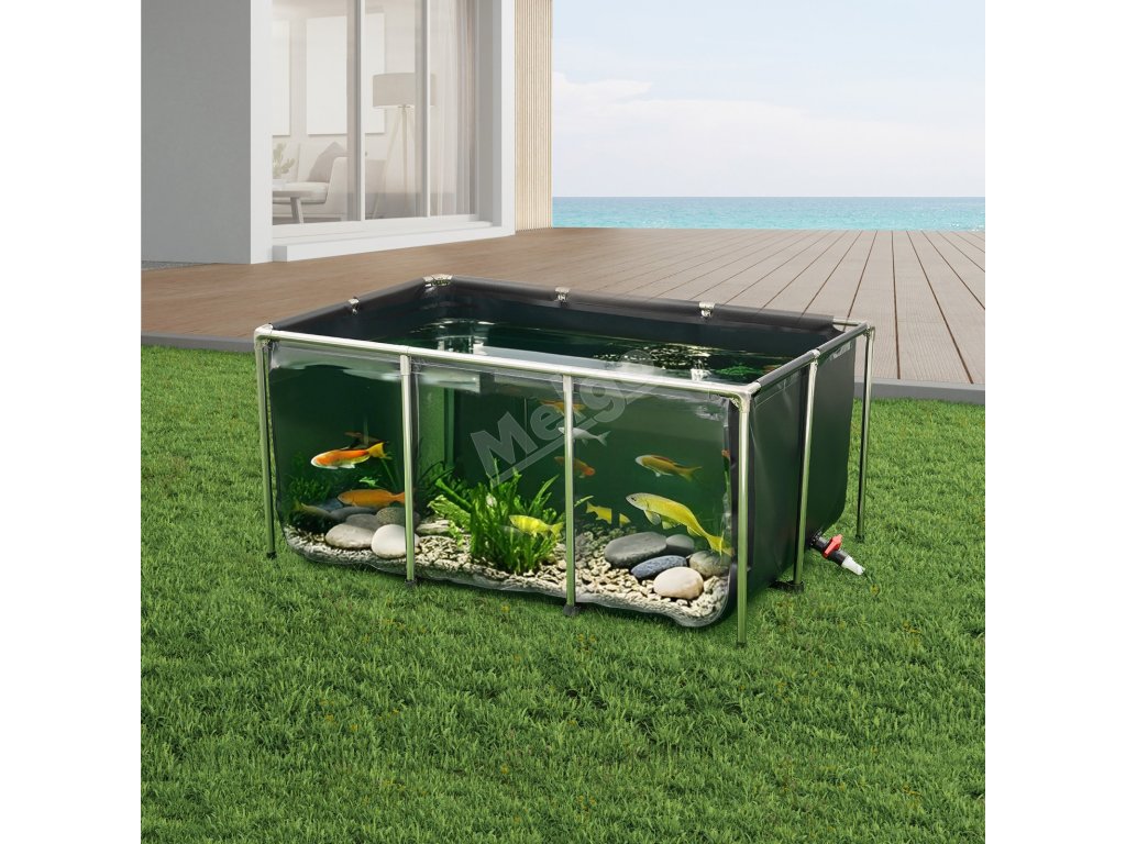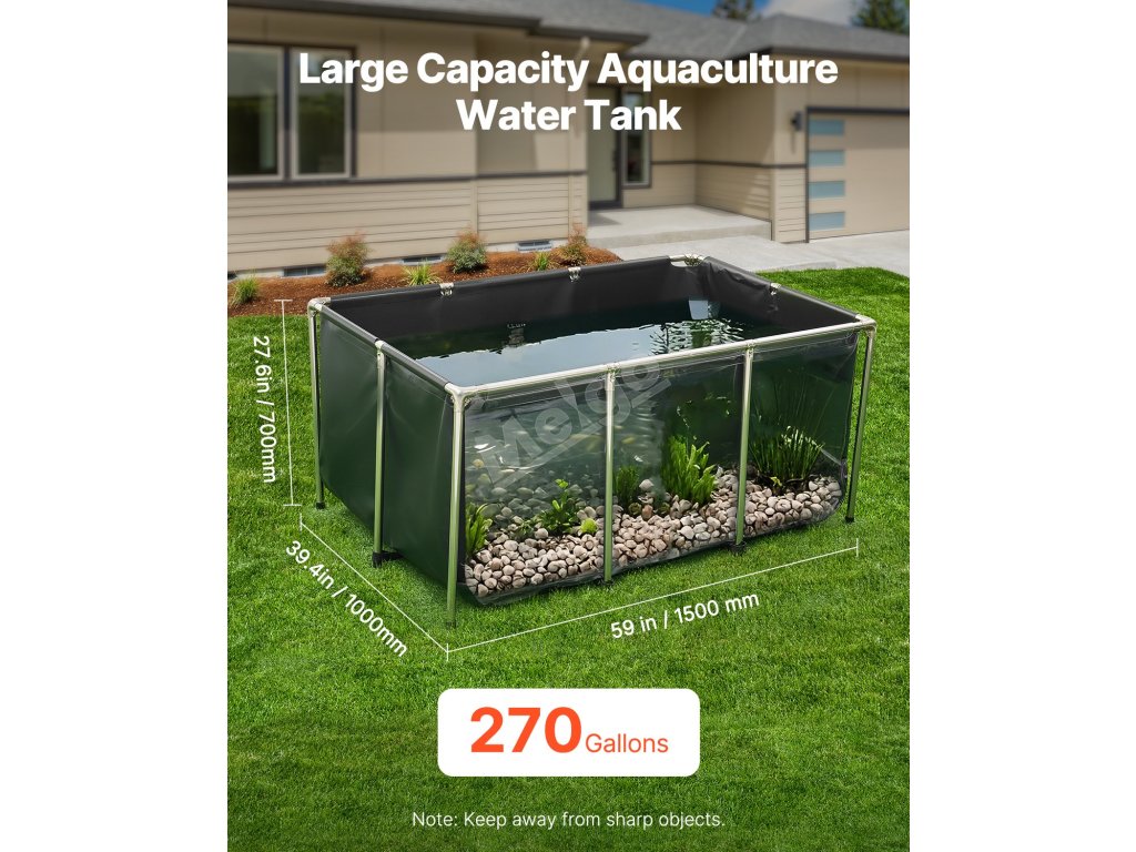 Jezírko je vyrobeno ze zesíleného PVC materiálu a vysoce průhledného PVC, je odolné proti roztržení a má bezešvé, vodotěsné švy. Díky trubkám z nerezové oceli a objemu 270 galonů je ideální pro vnitřní i venkovní použití pro koi, zlaté rybky, krevety, kraby atd.