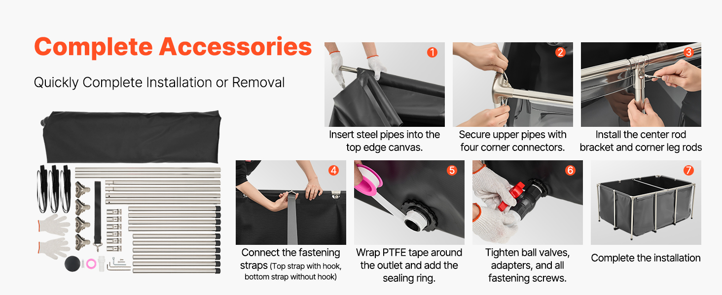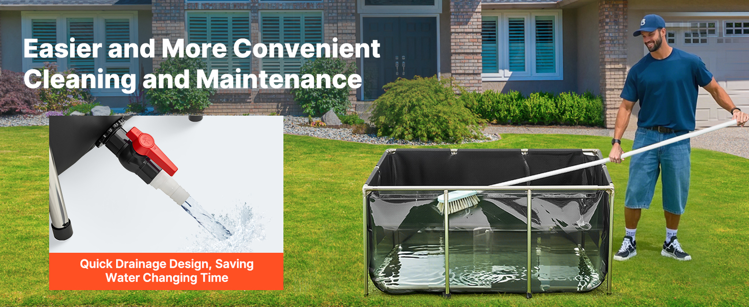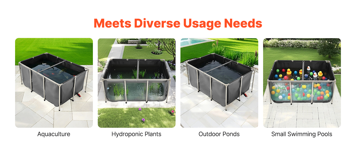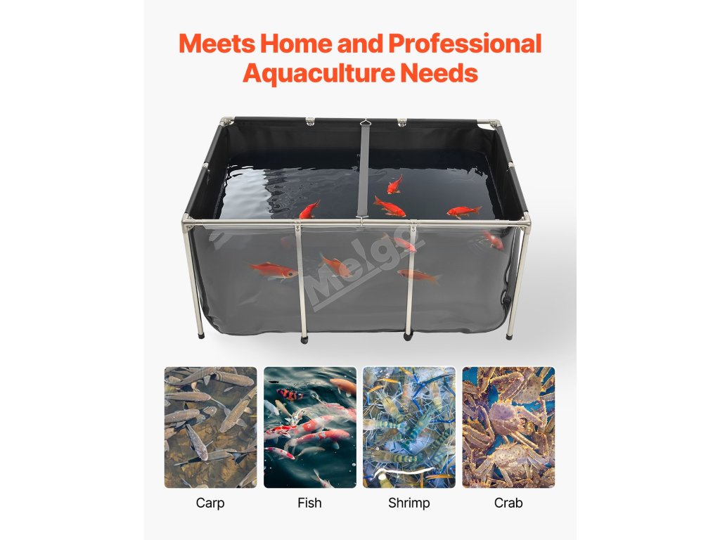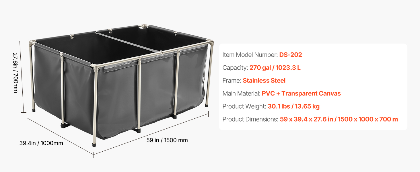 Jezírko je vyrobeno ze zesíleného PVC materiálu a vysoce průhledného PVC, je odolné proti roztržení a má bezešvé, vodotěsné švy. Díky trubkám z nerezové oceli a objemu 270 galonů je ideální pro vnitřní i venkovní použití pro koi, zlaté rybky, krevety, kraby atd.