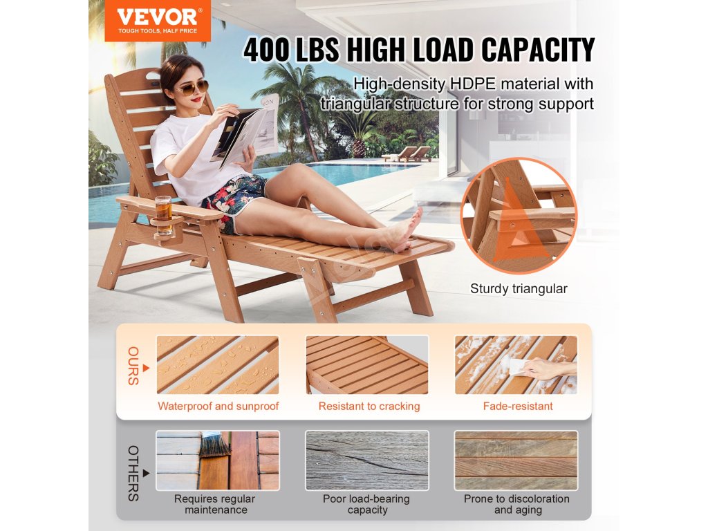 Užijte si široké područky a velký otočný držák na nápoje, který je ideální pro jakýkoli nápoj. Toto venkovní lehátko k bazénu je navrženo pro maximální pohodlí, takže se na vaší zahradě budete cítit jako na dovolené.