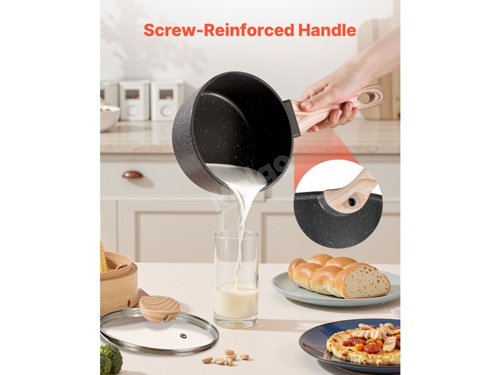 Hrnec s nepřilnavým povrchem je vybaven zesílenou poklicí z čirého skla pro snadnou kontrolu, rozšířeným okrajem pro nalévání polévky nebo mléka bez odkapávání a zesílenou rukojetí zajištěnou šrouby pro větší stabilitu. Rukojeť se snadno instaluje a je vyrobena tak, aby vydržela.