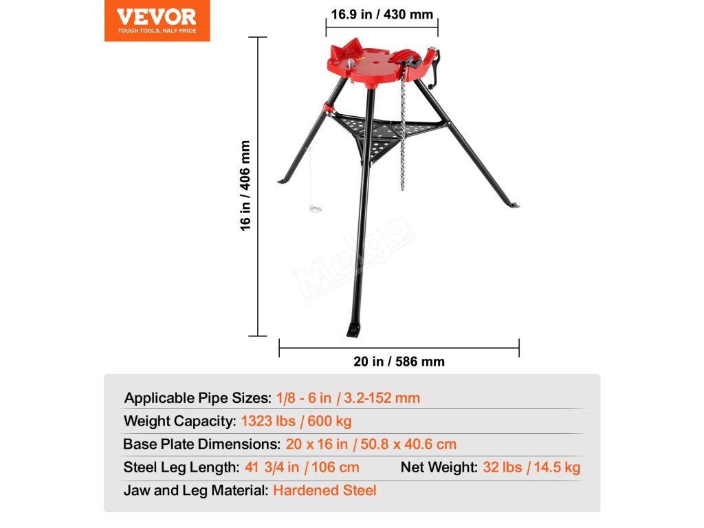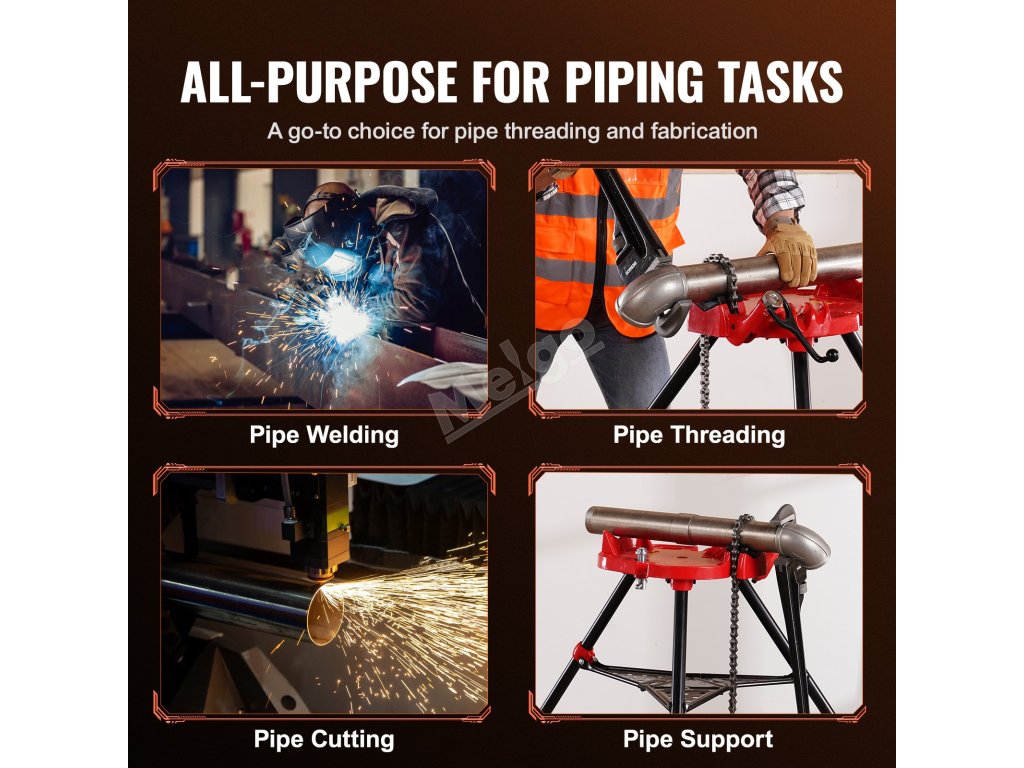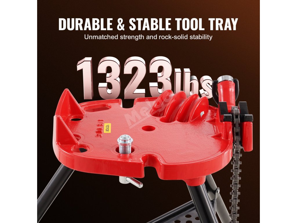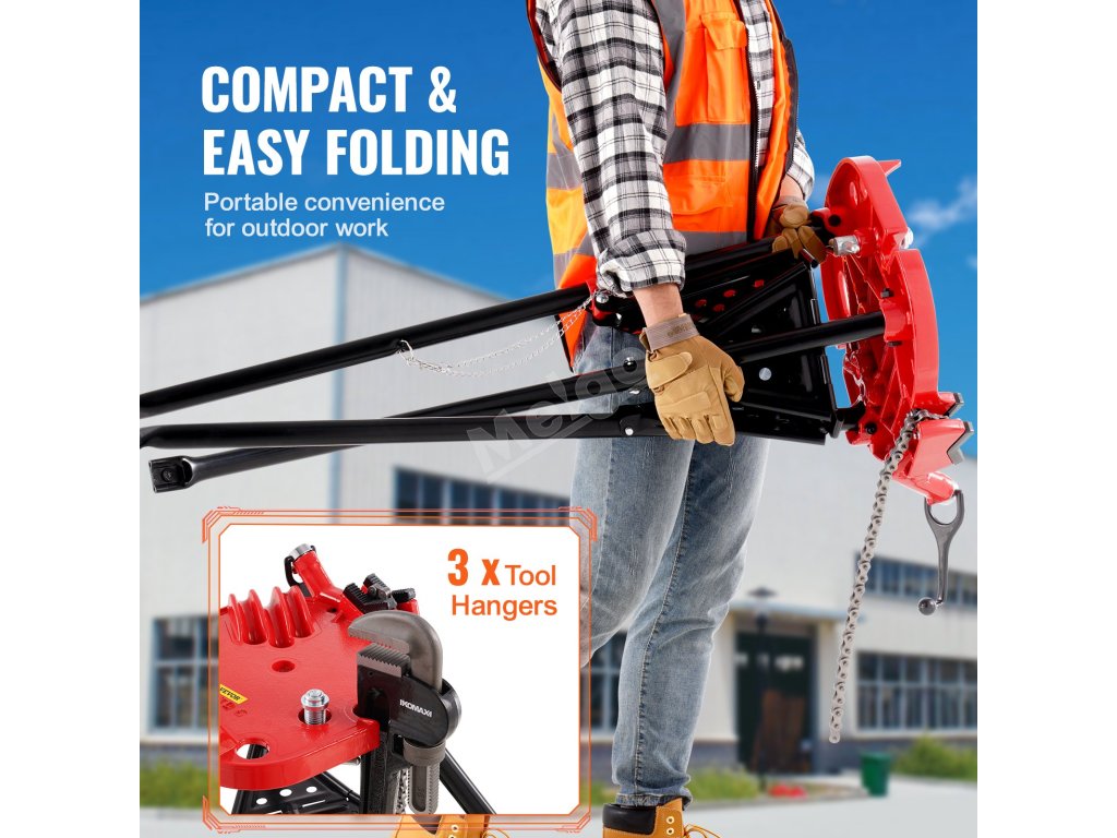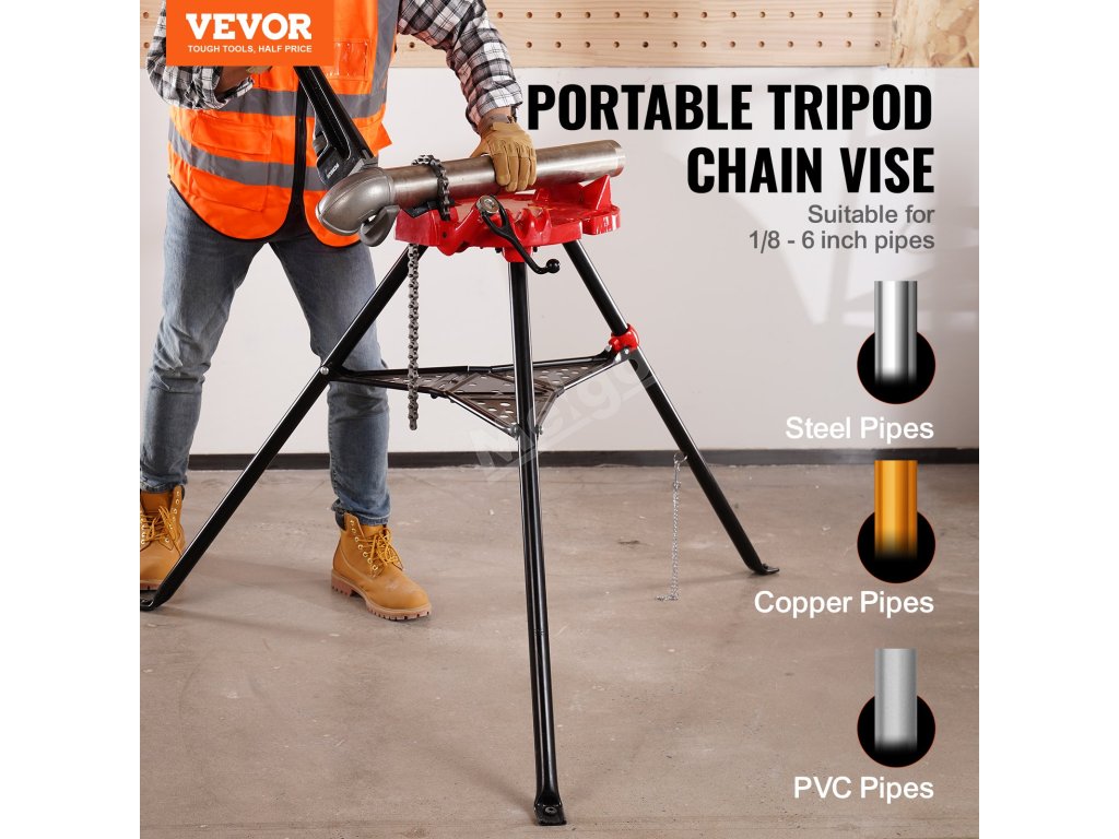 Trojnožka svěráku je ocelová, což zajišťuje dlouhou životnost. Ocelové nohy navíc stabilně udrží těžké trouby. Důmyslná konstrukce zvyšuje tření a udržuje stabilitu na zemi.