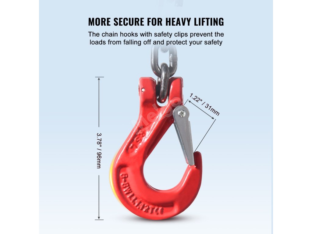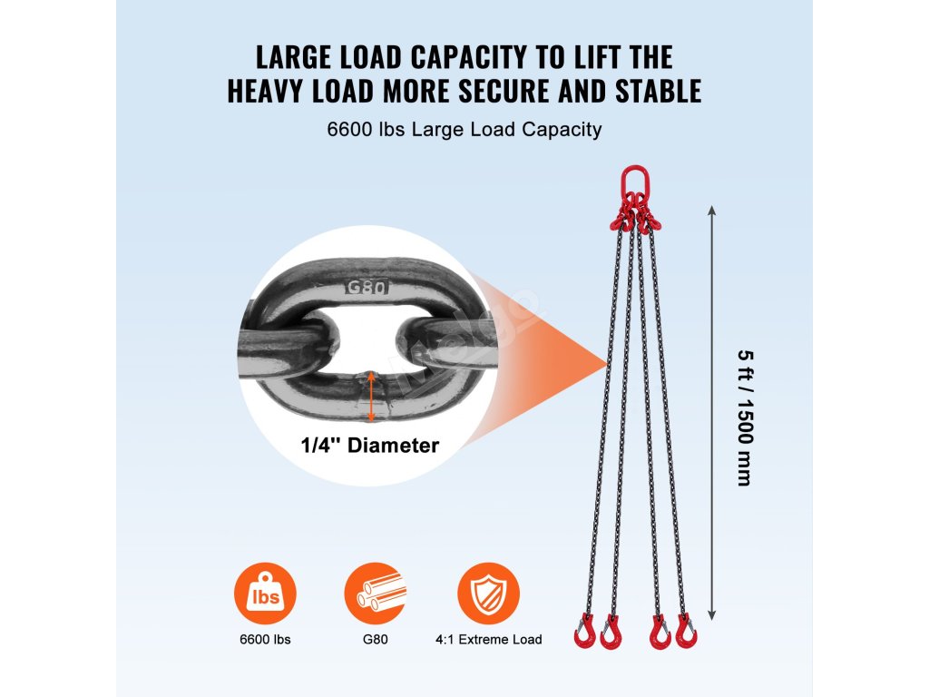 VEVOR, váš exkluzivní odborník na nářadí. Tento řetězový závěs je vyroben z vysoce kvalitní oceli. Má také háčky s pružinovými výstupky pro lepší uchopení a zajištění velkých nákladů.