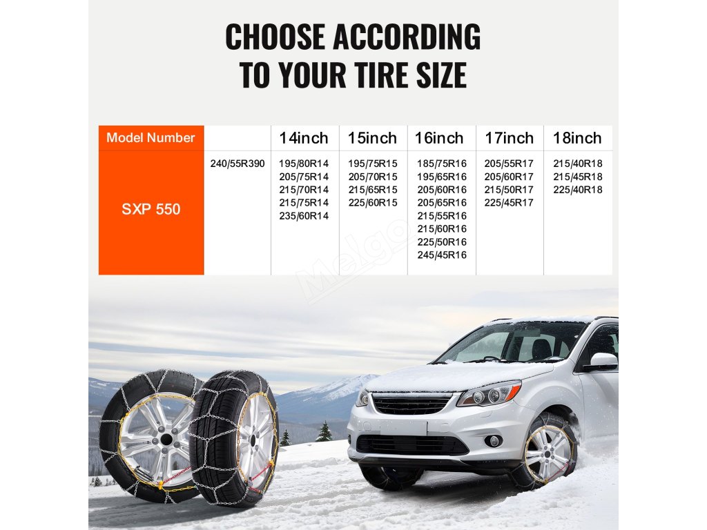 Naše sněhové řetězy jsou určeny pro osobní automobily, vozy SUV a nákladní automobily. Změřte šířku svých pneumatik, abyste zajistili správné nasazení a zajistili co nejtěsnější utažení sněhových řetězů pro bezpečnost a trvanlivost.