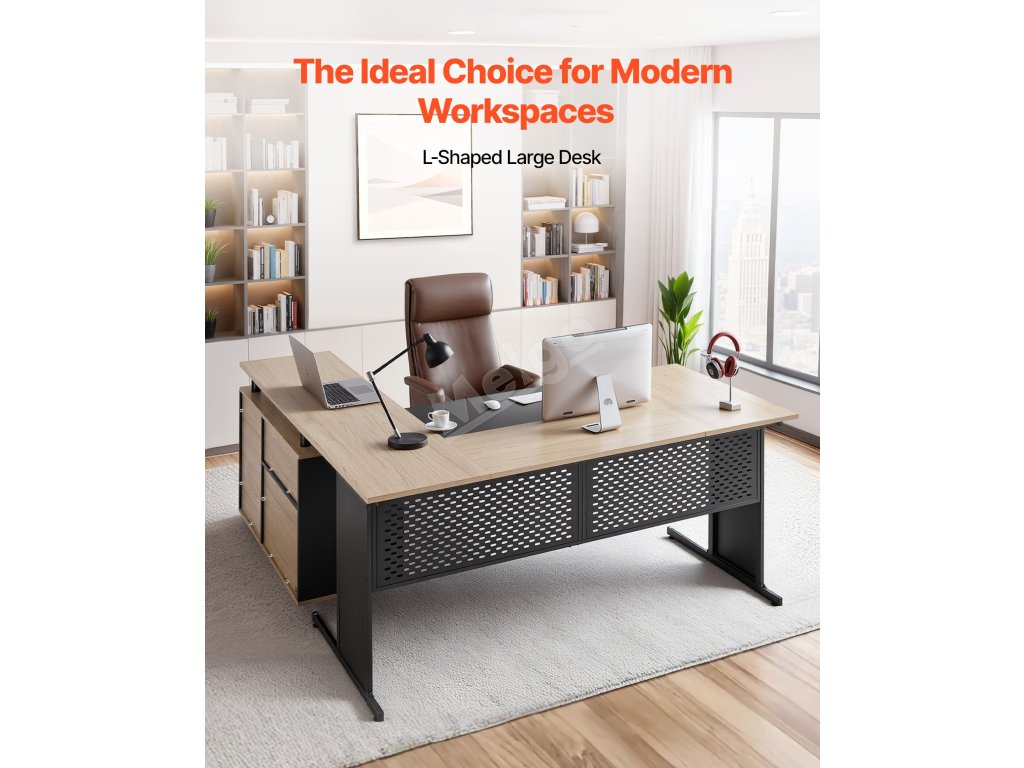 Tento velký stůl ve tvaru písmene L slouží jako počítačový stůl, kancelářský stůl, konferenční stůl, herní stůl nebo jídelní stůl. Jeho jednoduchý, přizpůsobivý design se hodí k různým stylům interiéru, takže je ideální pro domácí i kancelářské použití.