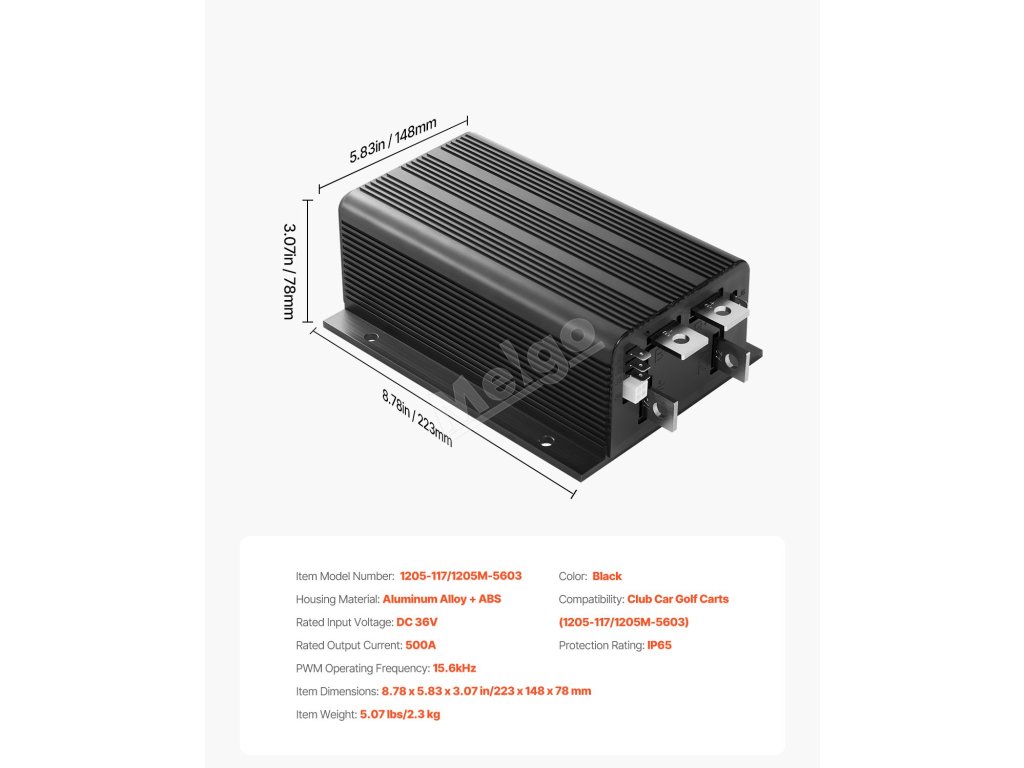 Náš regulátor rychlosti golfového vozíku je vhodný pro modely Club Car 1205-117/1205M-5603 a umožňuje snadné zapojení a použití. Díky 36V vstupu a 500A výstupu, vodotěsnosti IP65 a krytu z hliníkové slitiny a ABS vám zaručí tichou jízdu. Rychlý start a vysokofrekvenční odezva 15,6 kHz zvyšují účinnost a výkon.