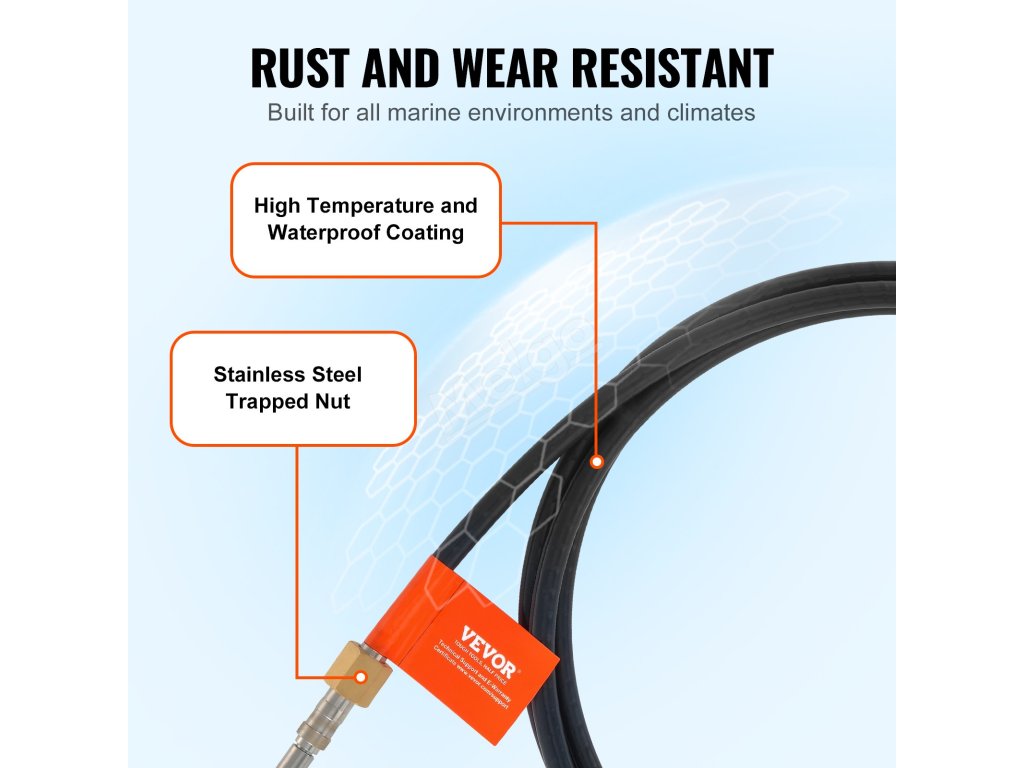 Ocelové ovládací lanko je potaženo pružným a vodotěsným polyethylenem, který zajišťuje vynikající odolnost proti povětrnostním vlivům, zatímco upevňovací matice z nerezové oceli odolávají korozi mořskou vodou, což zaručuje spolehlivé použití v mořském prostředí.
