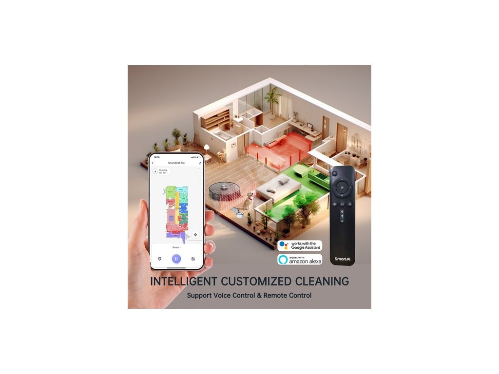 Pomocí aplikace můžete robota individuálně ovládat a vybírat režimy úklidu, uklízet konkrétní místnosti, nastavovat virtuální stěny, definovat oblasti, kterým se má vyhnout, atd. Aplikaci můžete také používat odkudkoli Pokud je k dispozici síť, můžete robota ovládat a sledovat na dálku. Prostřednictvím hlasových příkazů můžete robota spustit, pozastavit nebo zastavit pomocí asistenta Google Assistant nebo Amazon Alexa, takže automatický úklid bude ještě pohodlnější. Robot S8 Pro pro vysávání a mopování je také vybaven dálkovým ovladačem, který nabízí různé režimy ovládání pro snadnější obsluhu.