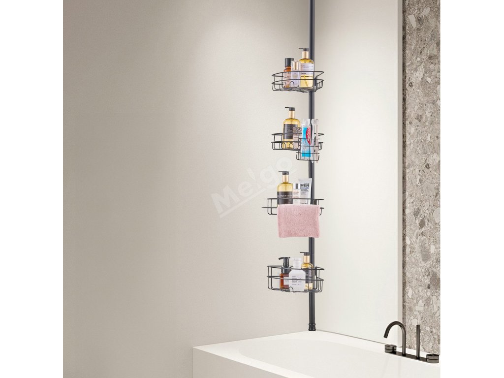Sprchovou napínací tyč lze nastavit v rozmezí od 56" do 114". Instaluje se bez vrtání. Vyhněte se instalaci na stropy nebo šikmé střechy. Je vyrobena z nerezové oceli a je vybavena uzamykacím mechanismem. Obsahuje čtyři prostorné vaničky a jeden držák na zubní kartáčky, jeden držák na ručníky.