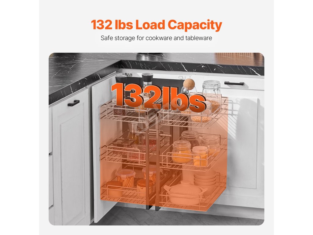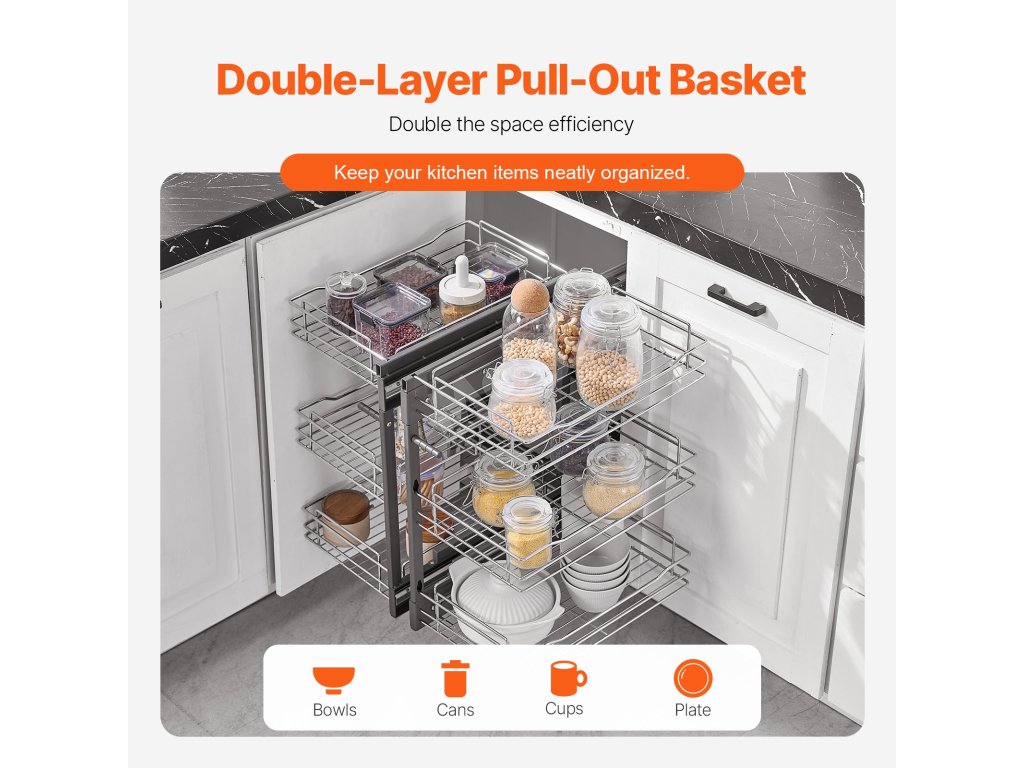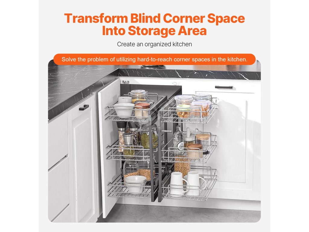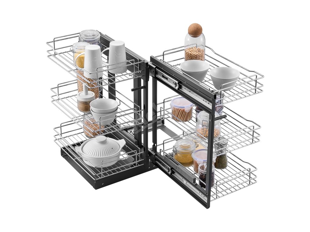 Náš organizér do slepého rohu je navržen tak, aby řešil slepá místa v rohu kuchyně a pomohl vám efektivně využít prostor. Díky velkokapacitnímu provedení do něj snadno uložíte různé kuchyňské předměty a můžete je plynule vytahovat, aniž byste se museli obávat těžko přístupných rohových předmětů.