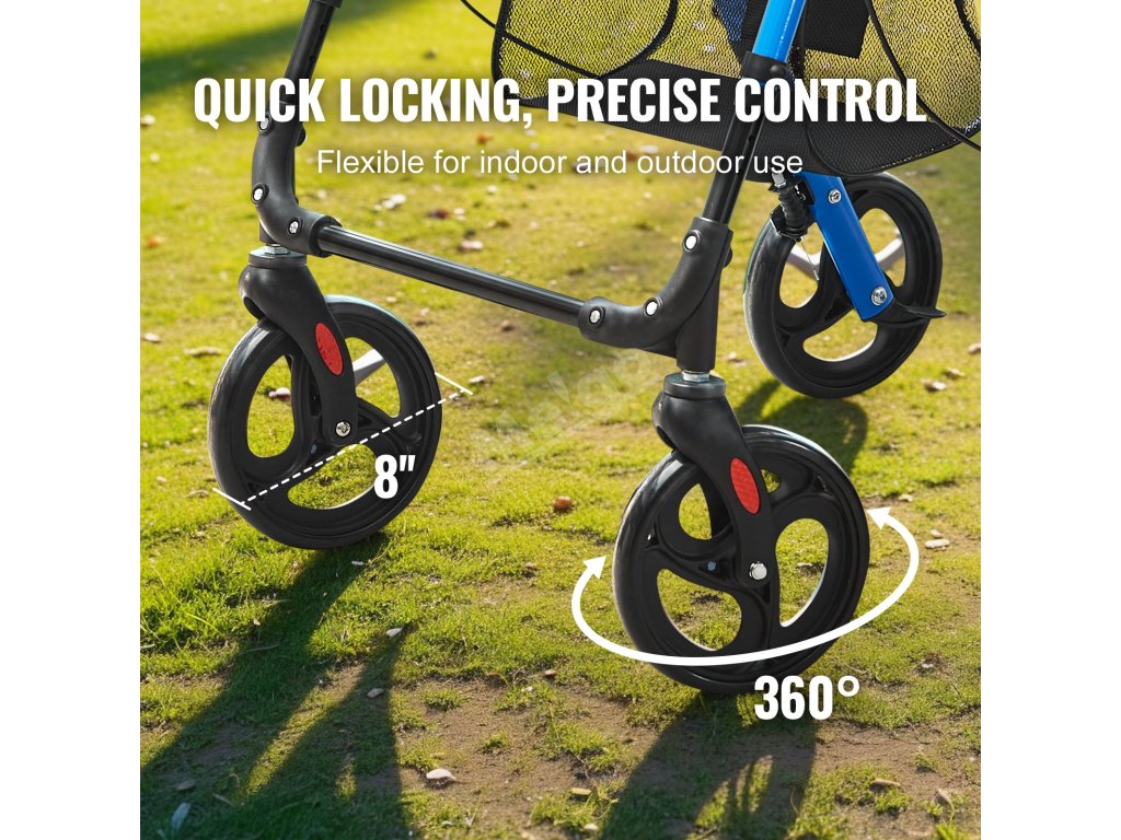 Snadné manévrování díky předním kolečkům otočným o 360° s protiskluzovým povrchem. Naše pojízdné chodítko, vybavené 8palcovými koly vpředu i vzadu, zajišťuje snadný pohyb po různých površích. Protiskluzový běhoun zlepšuje trakci a zajišťuje plynulou a bezpečnou jízdu.