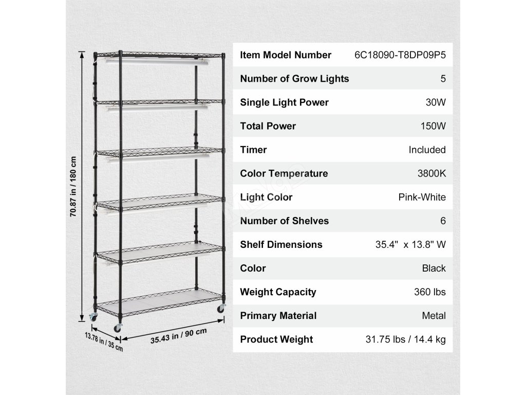 Rostlinný stojan se 150W růstovým světlem, 6 polic, 35.4"×13.8"×70.9"