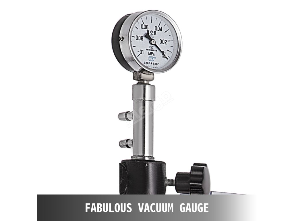 Vakuový systém je vybaven vakuometrem, který upravuje tlak vzduchu ve vakuovém systému a volí nižší optimální pracovní teplotu varu vakua pro daný materiál.