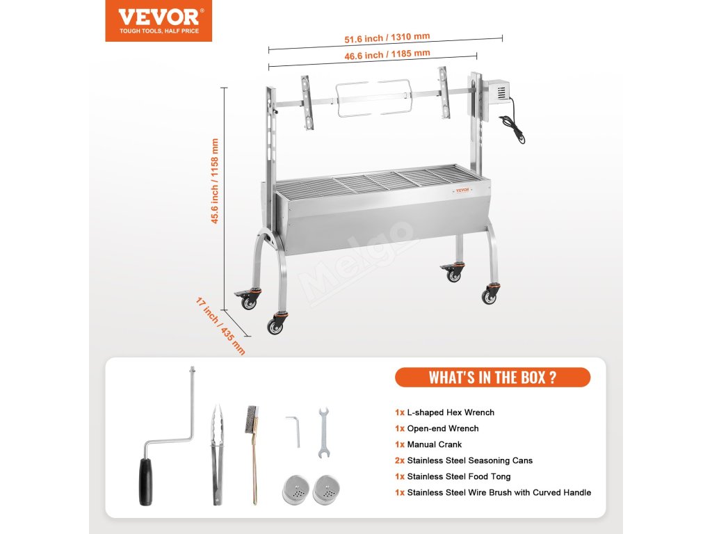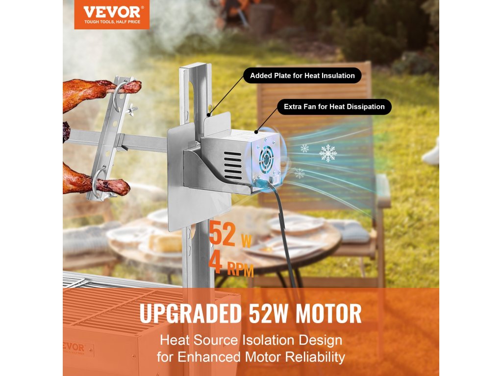 Grilování nebylo nikdy jednodušší s naší všestrannou grilovací sadou! Je vybavena výkonným 52W motorem, který bez námahy otáčí grilovací tyčí rychlostí 4 ot. Součástí balení je tepelně izolační deska a ventilátor, které poskytují vynikající izolaci a chlazení a zajišťují snadnou obsluhu.
