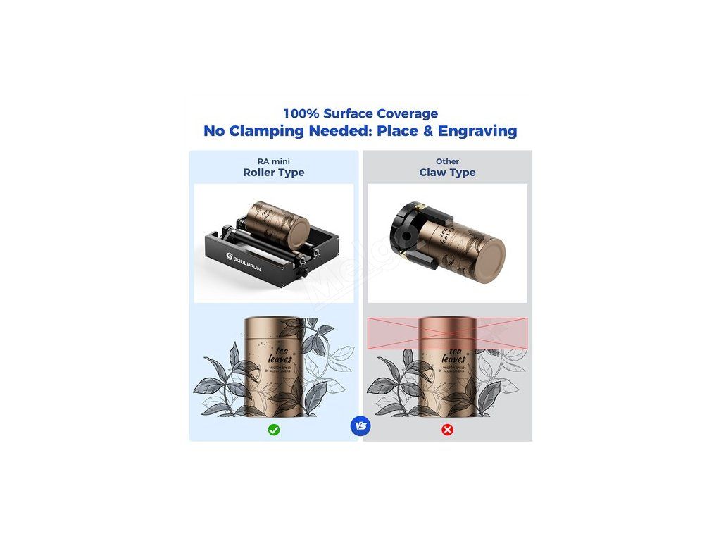 Tento rotační válec RA Mini je přizpůsoben pro zařízení Sculpfun iCube Ultra, řadu iCube a C1. Díky cílené optimalizaci konstrukce zajišťuje kompatibilitu hardwaru a shodu funkcí, poskytuje exkluzivní řešení gravírování a splňuje potřeby gravírování válcových předmětů.