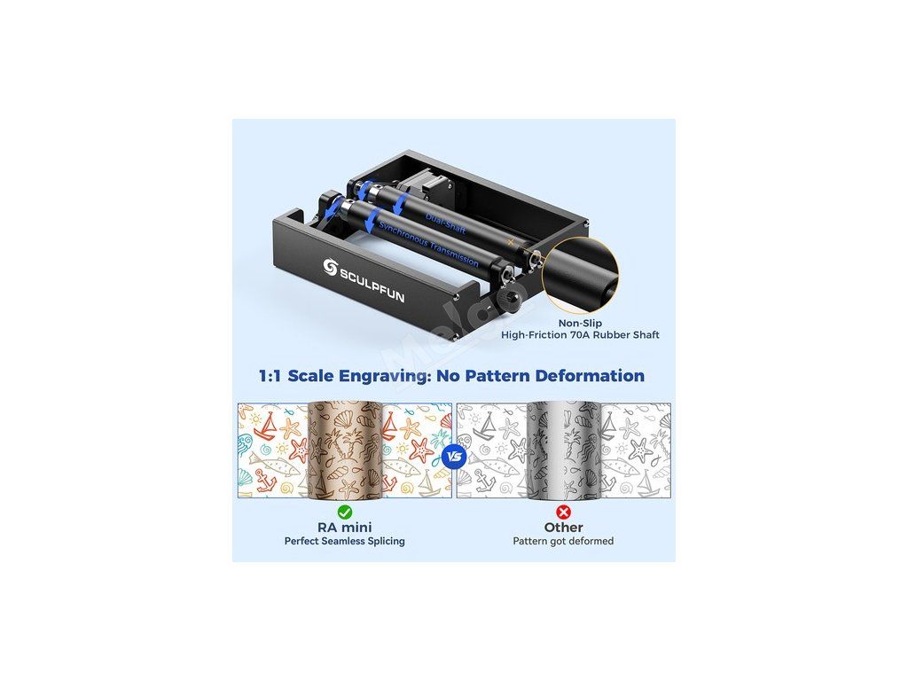 Je vybaven pryžovou hřídelí s vysokým třením 70 A a navržen s protiskluzovými prvky, aby přesně odpovídal rychlosti otáčení linky. Po připojení ke stroji lze gravírovaný obraz obnovit v poměru 1:1 bez odchylky v přiblížení/oddálení.