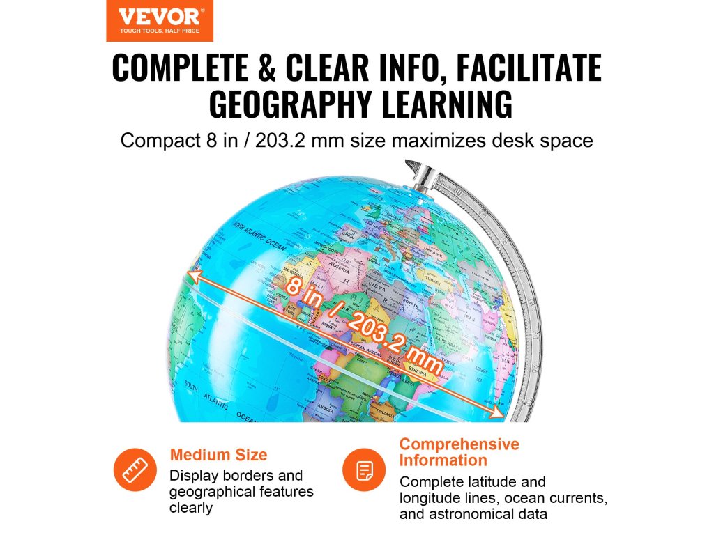 Náš globus o průměru 8 palců /203,2 mm zobrazuje mapu a hranice světa v úžasných detailech. Díky tisku ve vysokém rozlišení, který zajišťuje zřetelné hranice a popisky, mohou děti vizuálně prozkoumat země světa, hlavní města, mořské proudy, jezera a linie zeměpisné šířky a délky. Pokryje všechny vzdělávací potřeby!
